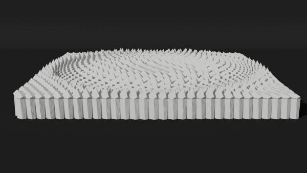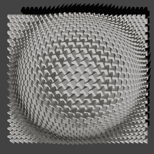 Durch das gezielte Verändern der Spitzen – in Höhe und Position – entsteht eine organische Oberfläche. Zusätzlich wurde das gesamte Raster von der Mitte aus proportional skaliert. So ergibt sich der Eindruck einer Kugel, obwohl die Struktur insgesamt relativ flach bleibt.