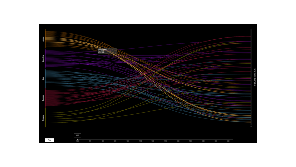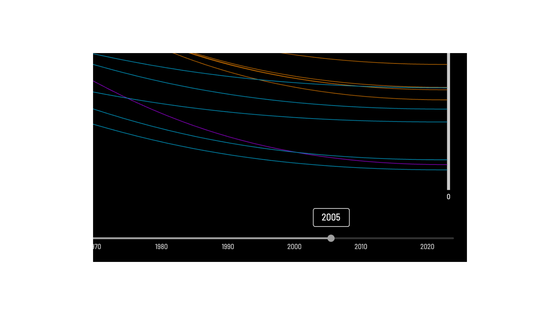 Im Zentrum steht der Vergleich zwischen den Kontinenten sowie der zeitliche Verlauf einzelner Länder. Jeder Staat ist farblich seinem Kontinent zugeordnet, wodurch sich globale Muster und regionale Unterschiede klar erkennen lassen. Eine animierte Darstellung zeigt den Wandel der Werte über die Jahrzehnte hinweg und macht Entwicklungen im Verlauf unmittelbar sichtbar.