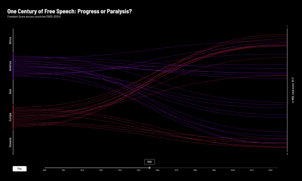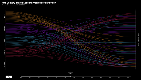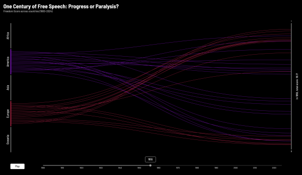 Unsere interaktive Visualisierung zeigt die weltweite Entwicklung der Freedom of Expression anhand des gleichnamigen Index von Our World in Data. Obwohl der Datensatz bis ins Jahr 1800 zurückreicht, konzentriert sich unsere Darstellung bewusst auf den Zeitraum ab 1900, da die Entwicklungen zwischen dem 20. und 21. Jahrhundert sowohl politisch als auch gesellschaftlich besonders prägend und aussagekräftig für den globalen Wandel der Meinungsfreiheit sind.
