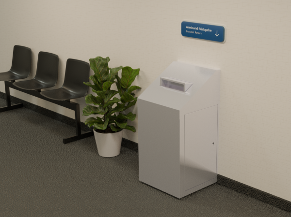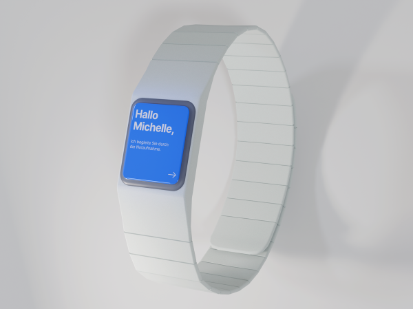 Das Armband bildet den Kern des OR3-Systems und begleitet Patient:innen gezielt durch ihren gesamten Aufenthalt in der Notaufnahme. Es verfügt über ein integriertes Interface und nutzt Vibrationen zur Unterstützung der Navigation innerhalb der Notaufnahme. Das Armband fördert Orientierung, Transparenz und Sicherheit im Klinikalltag.