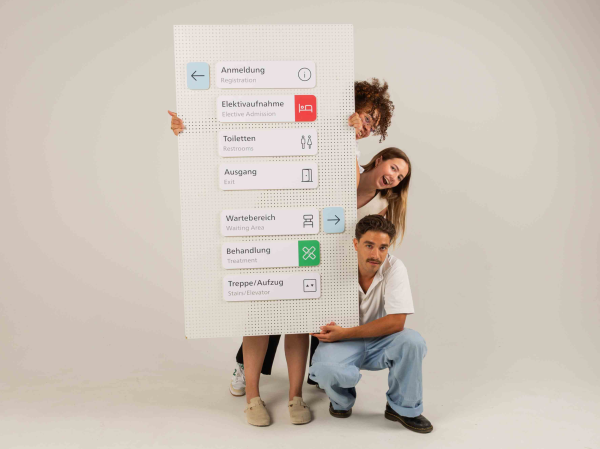 Ergänzend zum Armband wurde ein modulares, analoges Orientierungssystem entwickelt, das als zweite, jederzeit verfügbare Ebene der Wegführung in der Notaufnahme dient. Es bietet ein zuverlässiges Sicherheitsnetz, auch im Notfall, und ist dank des Steckmechanismus flexibel einsetzbar.