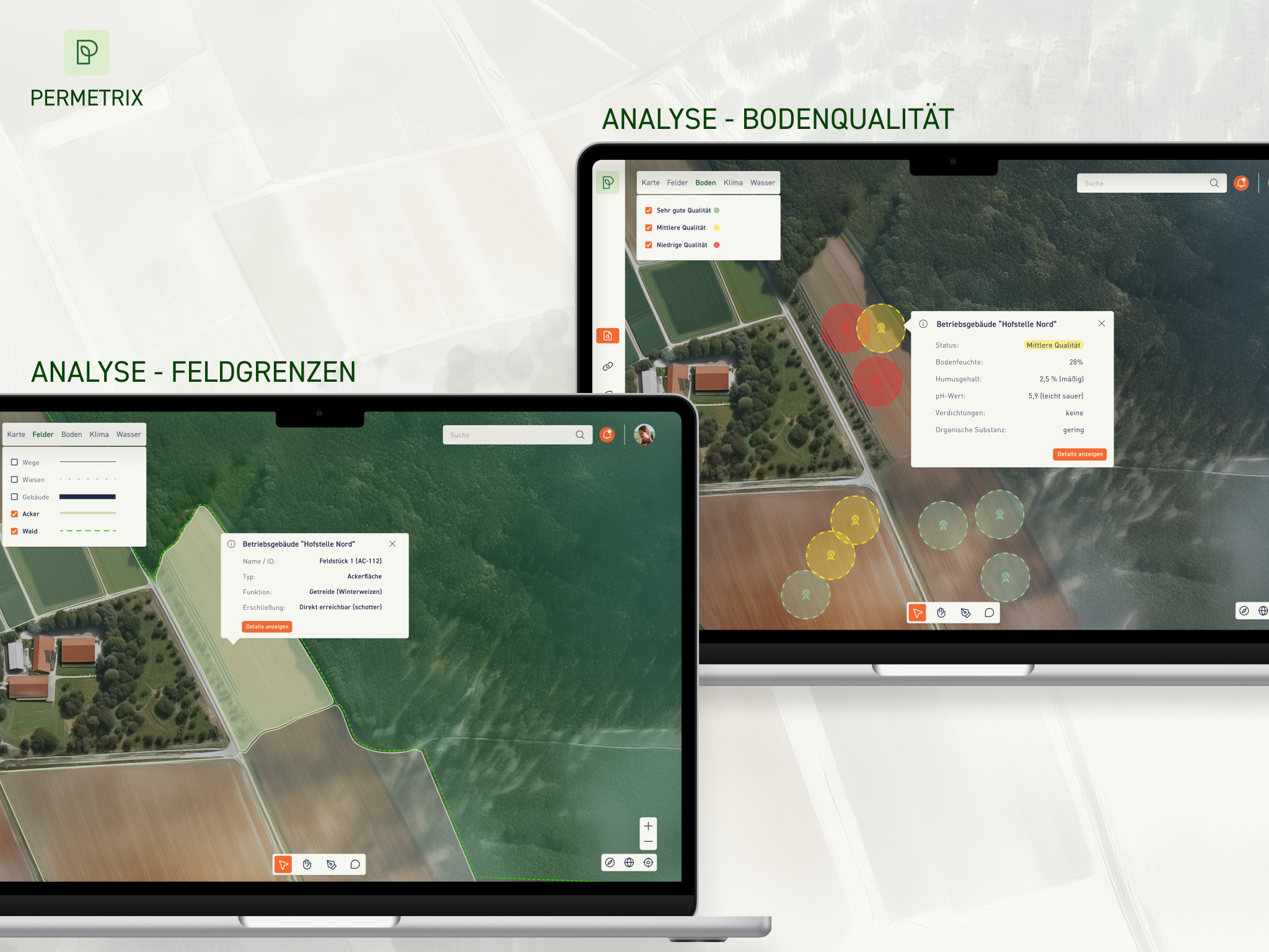 Das Analysemodul bildet die Grundlage von Permetrix. Es erhebt, verarbeitet und visualisiert sowohl Makro- als auch Mikrodaten, die für eine präzise Ausgangsanalyse entscheidend sind. Dazu gehören Informationen über Betriebsstrukturen wie Flächen, Wege und Gebäude, ebenso wie Daten zu Bodenprofilen und Humusgehalt, Klima- und Wetterbedingungen, topografische Gegebenheiten und der Wasserhaushalt sowie Biodiversitäts- und Habitatinformationen. Diese umfassende Datensammlung schafft die Basis für eine standortangepasste und fundierte Planung.