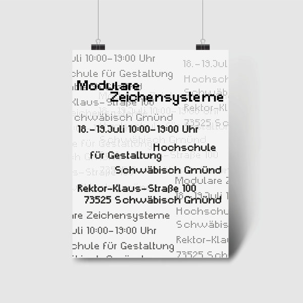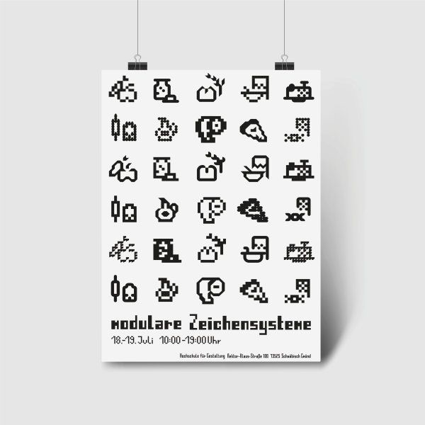 Unsere finale Aufgabe war es, ein Plakat zum Thema “modulare Zeichensysteme” zu entwerfen. Bei der Gestaltung durften wir ausschließlich unsere eigenen Schriften und Icons verwenden, waren thematisch aber ganz frei. So sind viele unterschiedliche Plakate entstanden. Eine Auswahl derer dürfen wir hier zeigen.