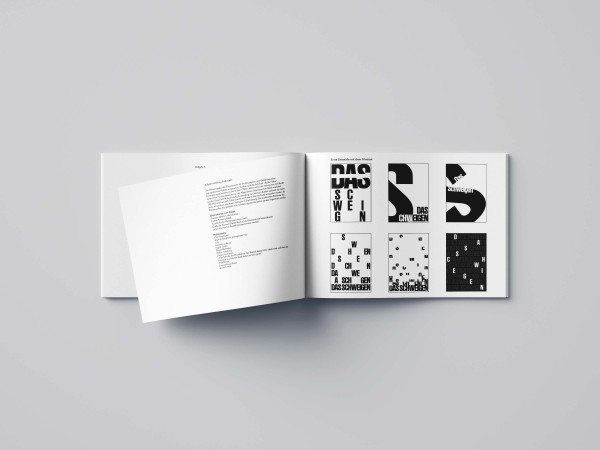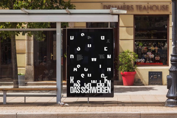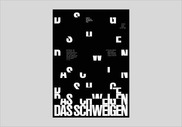 Ich wollte für mein Plakat auf die Aufgaben der Vorlesungen eingehen. Deshalb habe ich mich entschieden, den Filmtitel „Das Schweigen“ mit der vorgegebenen Schriftart „Ruder Plakat“ aufzusplitten und jeweils interessante Ausschnitte der Buchstaben zu zeigen. Für die Informationsebene habe ich die Schrift „Helvetica“ verwendet und auf dem Plakat verteilt. Hier habe ich auf die Bezugslinien der Buchstaben geachtet um eine systematische Anordnung zu erzeugen. Da ich „Schweigen“ mit Stille und Dunkelheit assoziiere, habe ich mich bewusst für einen schwarzen Hintergrund mit weißer Schrift entschieden.