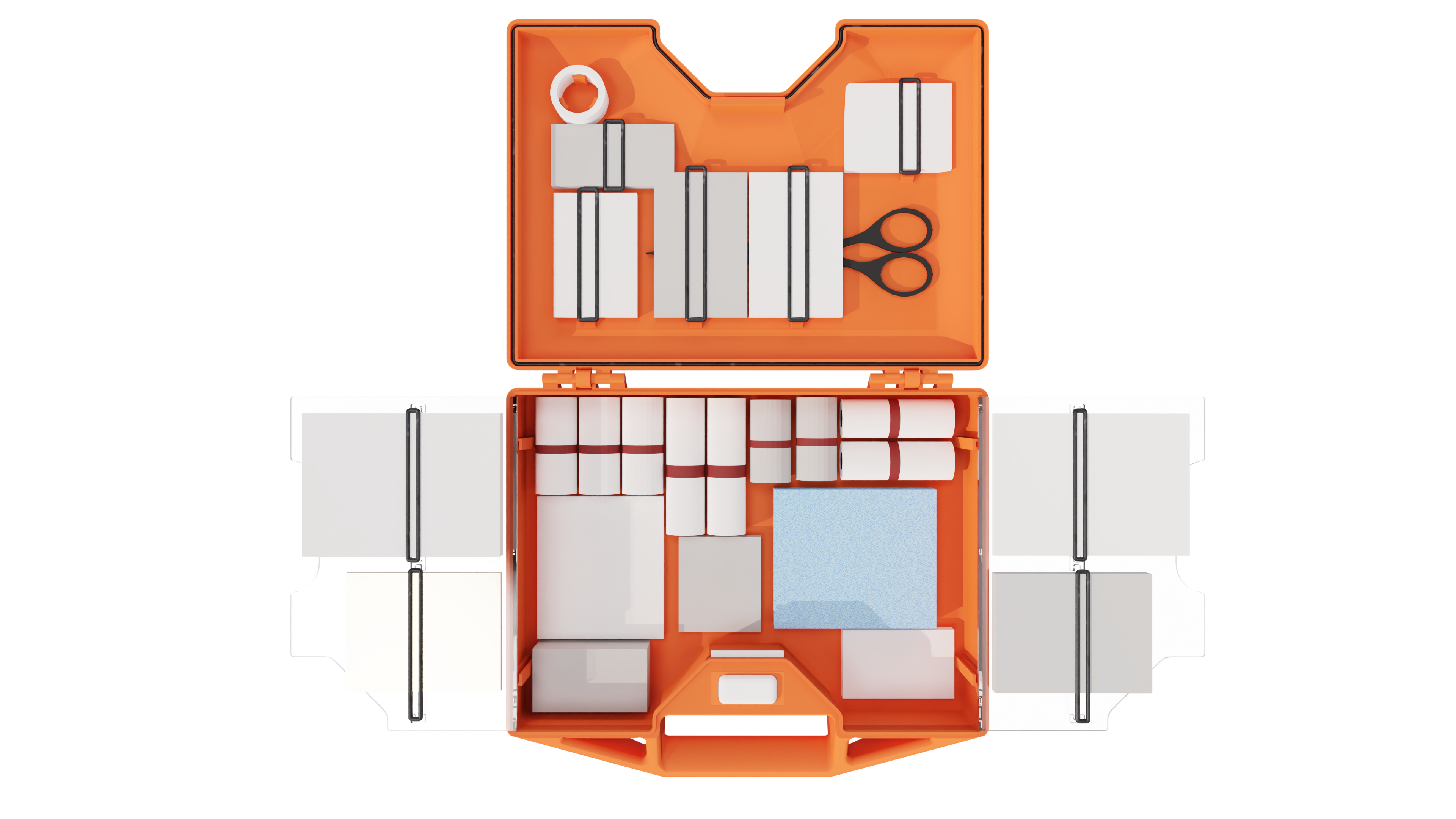 quickAID ist ein verbesserter Erste-Hilfe-Kasten. Ein optimierter Öffnungsmechanismus und die übersichtliche Anordnung der Utensilien sorgen für eine schnellere Versorgung im Vergleich zum Standard der Industrie.