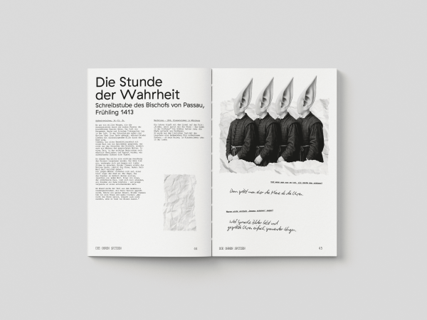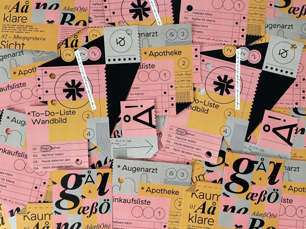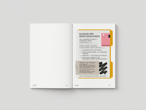 Gestalterisch entschieden wir uns für ein großzügiges DIN A4-Format, eine offene Fadenheftung in Schweizer Broschur und ein durchdachtes typografisches Konzept mit drei komplementären Schriftsystemen. Farbakzente in Watermelon Pink, Signalgelb und Oat strukturieren das Editorial und weisen auf interaktive Inhalte hin. Ergänzt wird das Buch durch Lesezeichen und Rätselkarten, die als physische Lern- und Spielimpulse dienen.