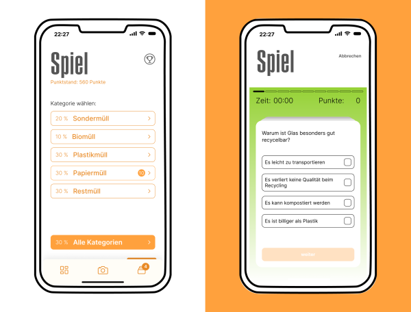 Zusätzlich gibt es ein Quiz, bei dem du Fragen rund um Recycling beantworten kannst. Für richtige Antworten sammelst du Punkte, falsche Antworten ziehen Punkte ab – so lernst du ganz nebenbei noch mehr.