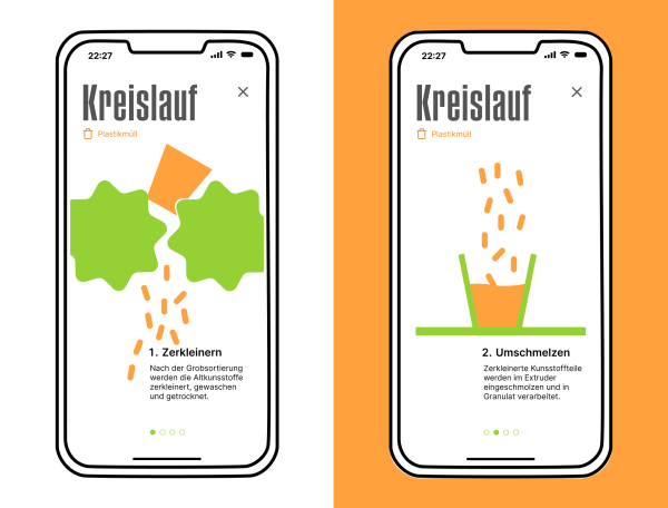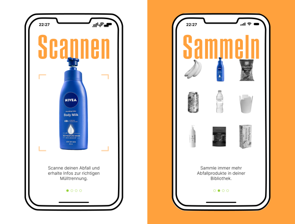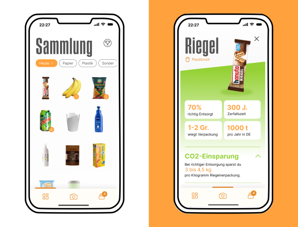 Dann startet direkt die Kamera. Du kannst sofort Müll scannen – unsere KI erkennt das Produkt und zeigt dir, wie du es richtig entsorgst und die wichtigsten Informationen zum Produkt. Außerdem kannst du den Recycling-Kreislauf des Produkts wie eine Instagram-Story durchklicken.