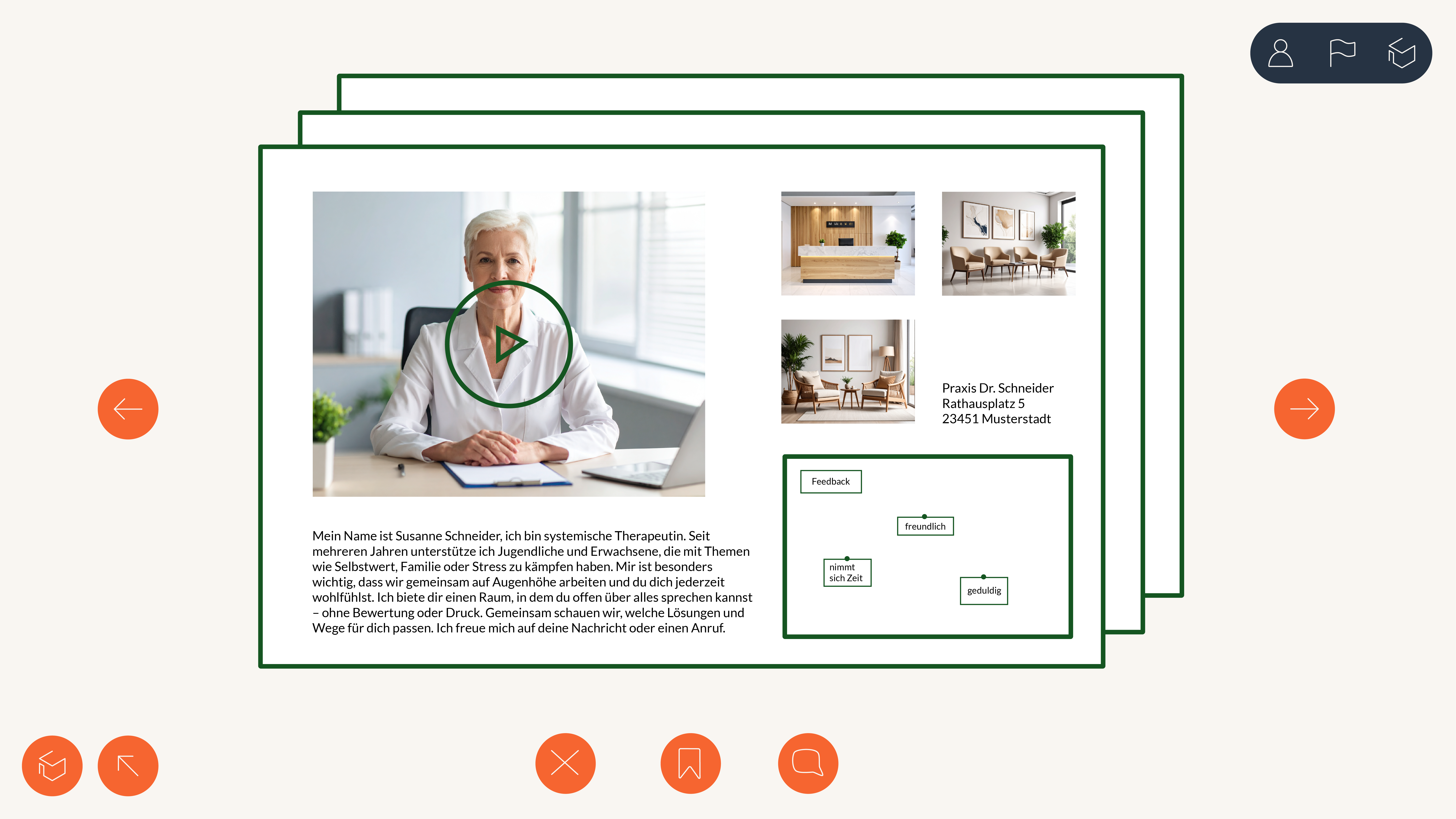 Ein kurzer, gezielter Fragebogen erfasst persönliche Bedürfnisse und schlägt über den Therapiekompass passende Therapeut:innen mit freien Plätzen vor, die als Karten präsentiert werden und durch einfaches Wischen ausgewählt werden können – intuitiv, spielerisch und ohne Druck.