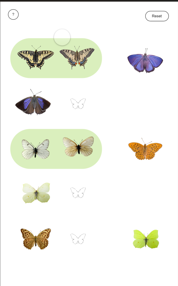Unser digitaler Beitrag ist ein interaktives Memory-Spiel. Die Spieler:innen ordnen männliche und weibliche Schmetterlinge der gleichen Art einander zu. Dabei zeigt sich: Auch innerhalb einer Art können Farbunterschiede groß oder erstaunlich ähnlich sein. Das Spiel lädt dazu ein, genau hinzusehen – und zu hinterfragen, ob die Farben nur dekorativ oder gezielt eingesetzt sind.