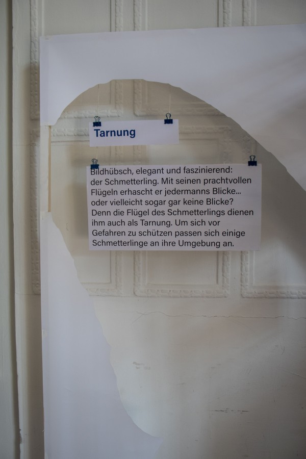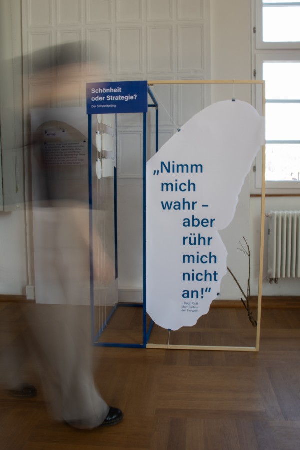 Um die luftige Anmutung zu bewahren, wurden Informationen und Bilder nicht flächig verklebt, sondern leicht aufgehängt. Die Inhalte erklären unter anderem, wie sich Schmetterlinge mithilfe ihrer Farben vor Fressfeinden schützen – etwa durch Mimikry, also das Nachahmen gefährlicher Arten, oder durch plötzliche Farbkontraste, die Angreifer erschrecken.