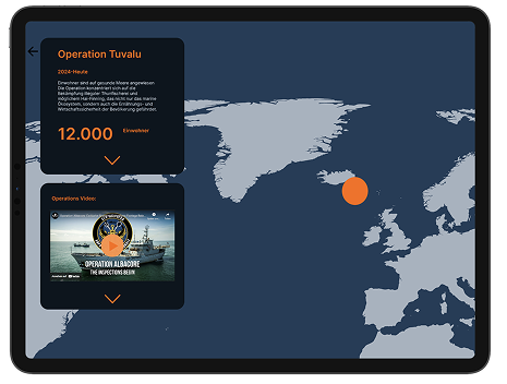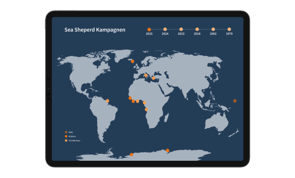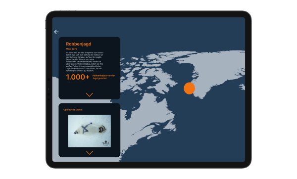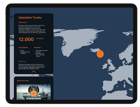 Die digitale Anwendung dient als inhaltliche Erweiterung der letzten Seite des Leporellos. Nutzer können interaktiv die Einsätze von Sea Shepherd erkunden. Über eine Jahresleiste lassen sich unterschiedliche Jahre auswählen, um gezielt nach einzelnen Missionen zu suchen. Farbcodierte Punkte markieren Einsatzorte und zeigen, welche Tierarten geschützt wurden. Ein Klick auf eine Mission öffnet eine Detailansicht mit Informationen, Bildern und Videos zur jeweiligen Operation.