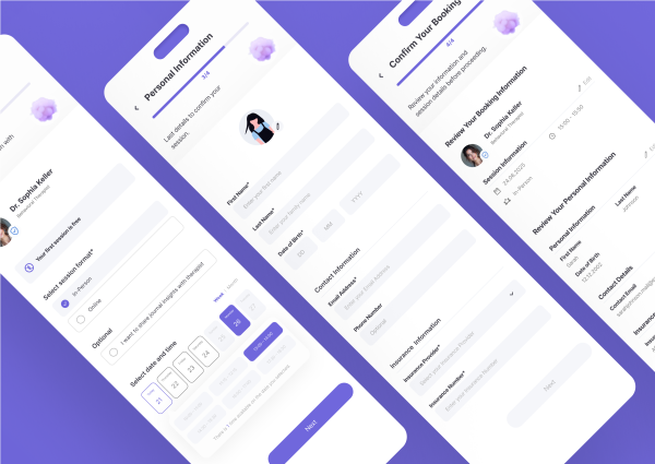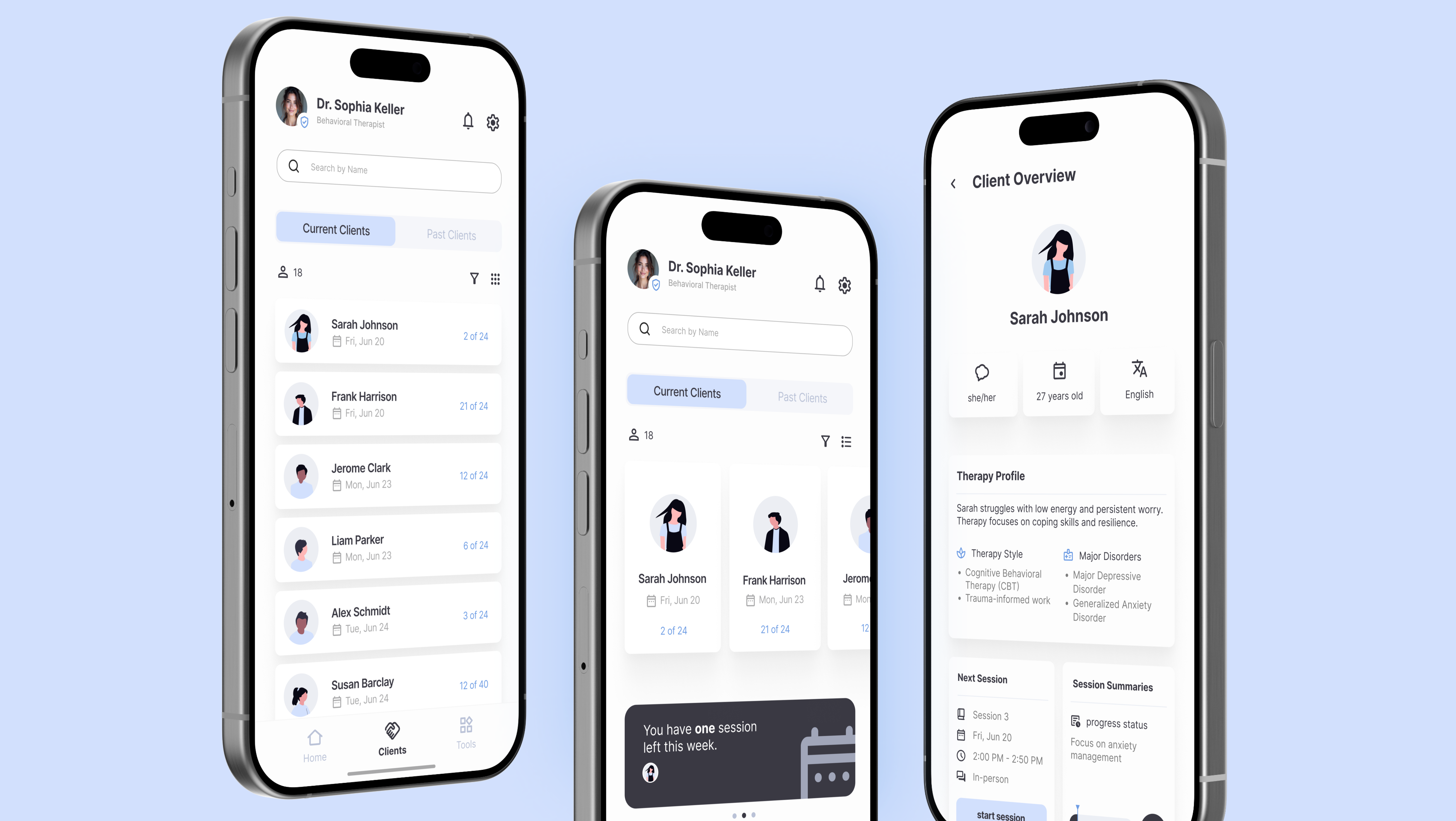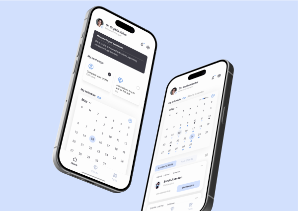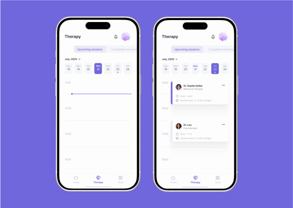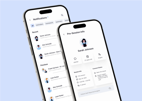 A clear overview of all upcoming sessions and active clients. From here, sessions can be started directly or therapists can access detailed pre-session information to prepare thoroughly. This central hub keeps everything organized and easy to manage.