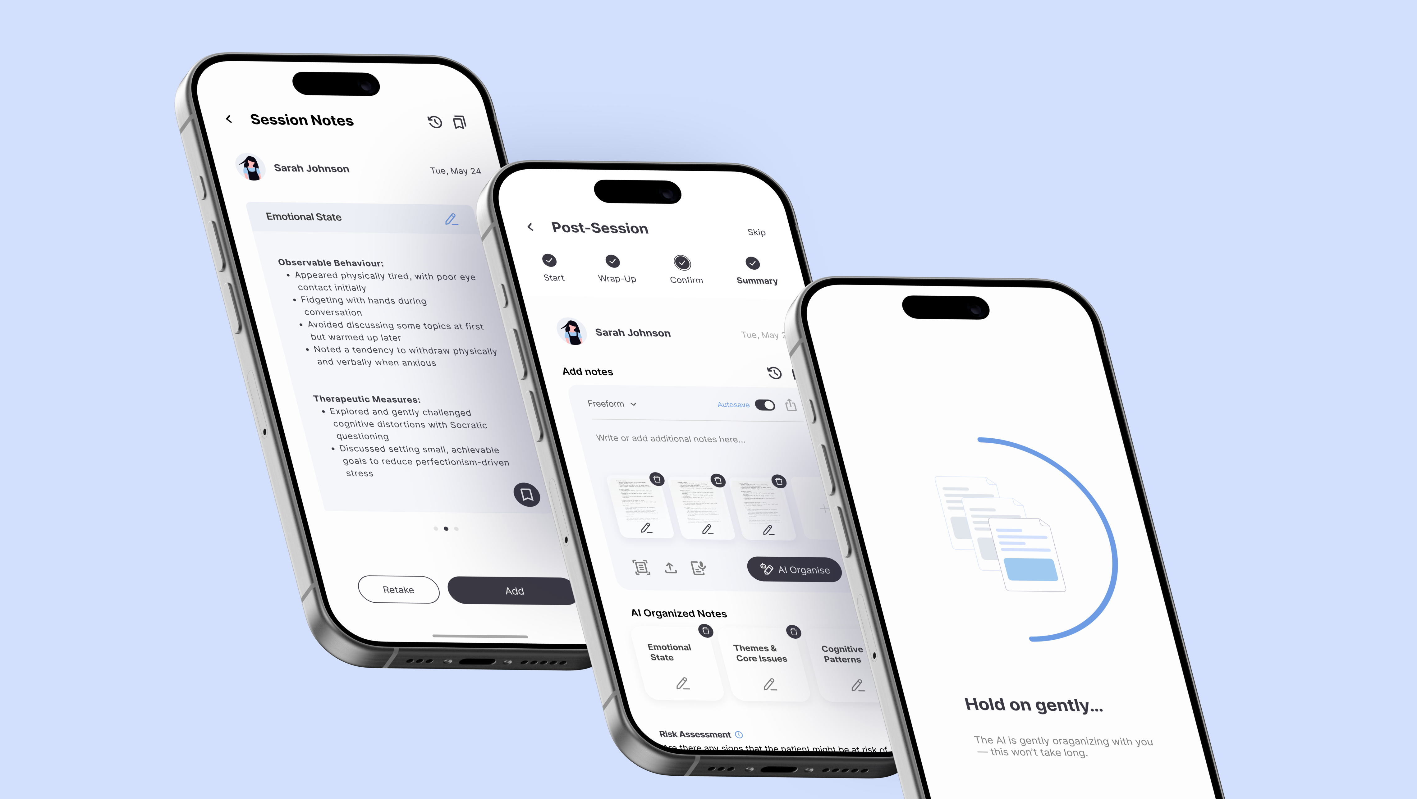 Handwritten notes can be scanned and saved directly within the app. Optionally, AI organizes the notes by themes to keep information clear and easy to find. This helps maintain a well-structured record of each client’s progress over time.
