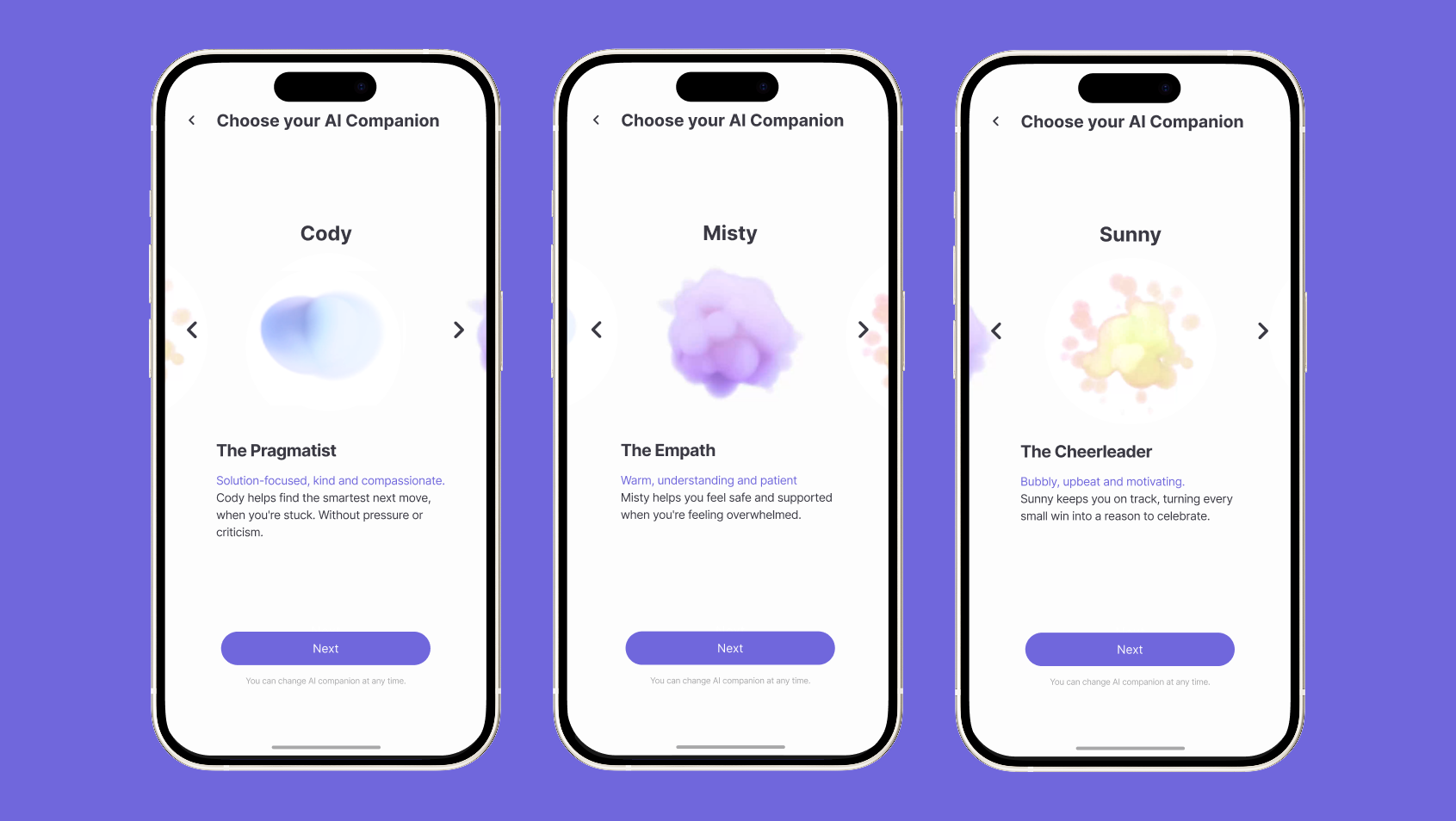 Three distinct AI personalities offer support in different ways: the Empath listens with warmth, the Pragmatist offers clear structure, and the Cheerleader brings motivation and encouragement. This variety helps make each journey feel more personal, relatable, and comfortable.