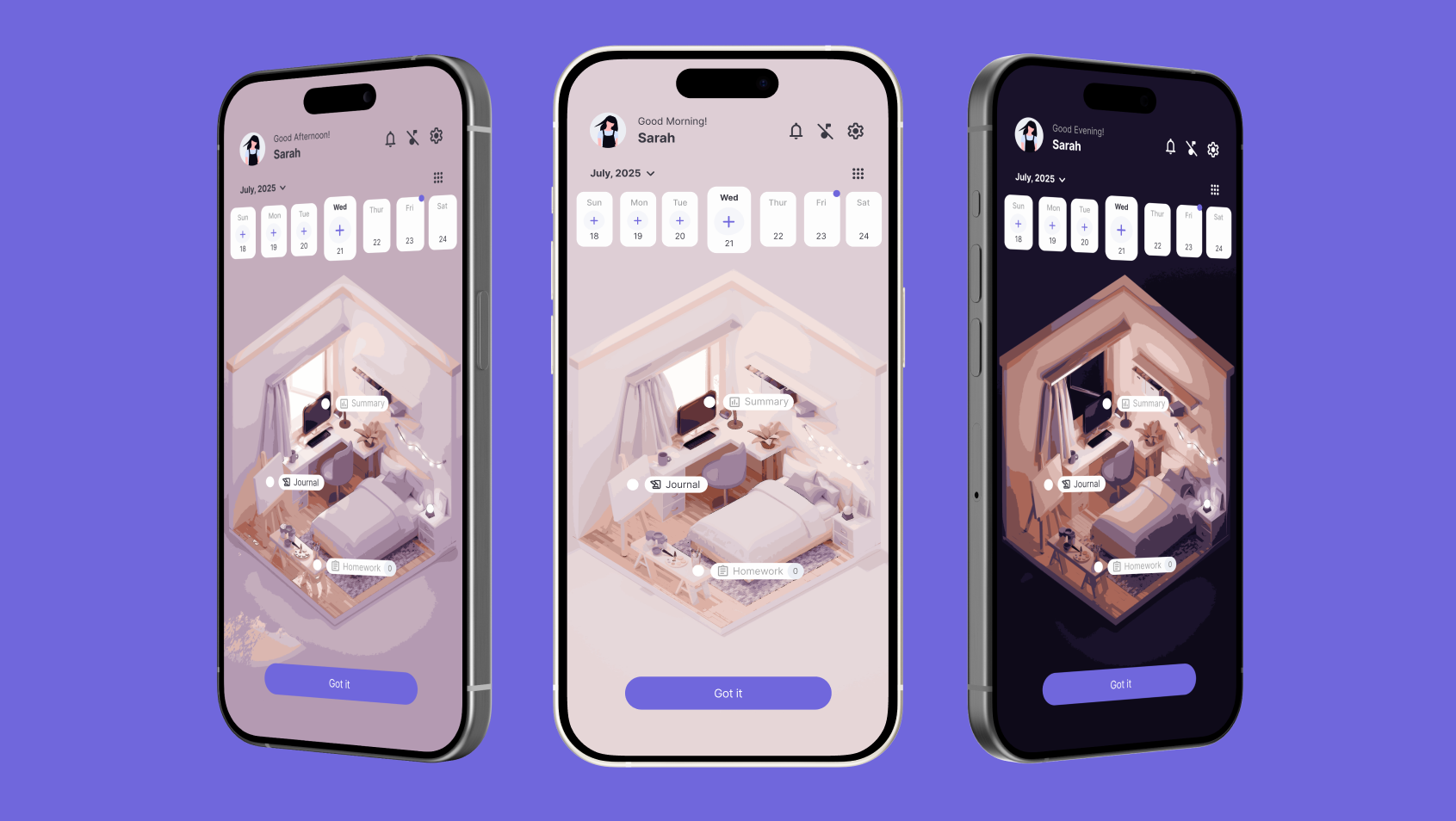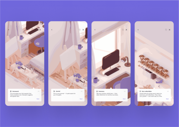 A calming, personalized digital room serves as the main dashboard. It adapts throughout the day, shifting from morning to night, creating a soothing atmosphere. Most-used features are easily accessible here, along with trophies earned as achievements to celebrate progress.