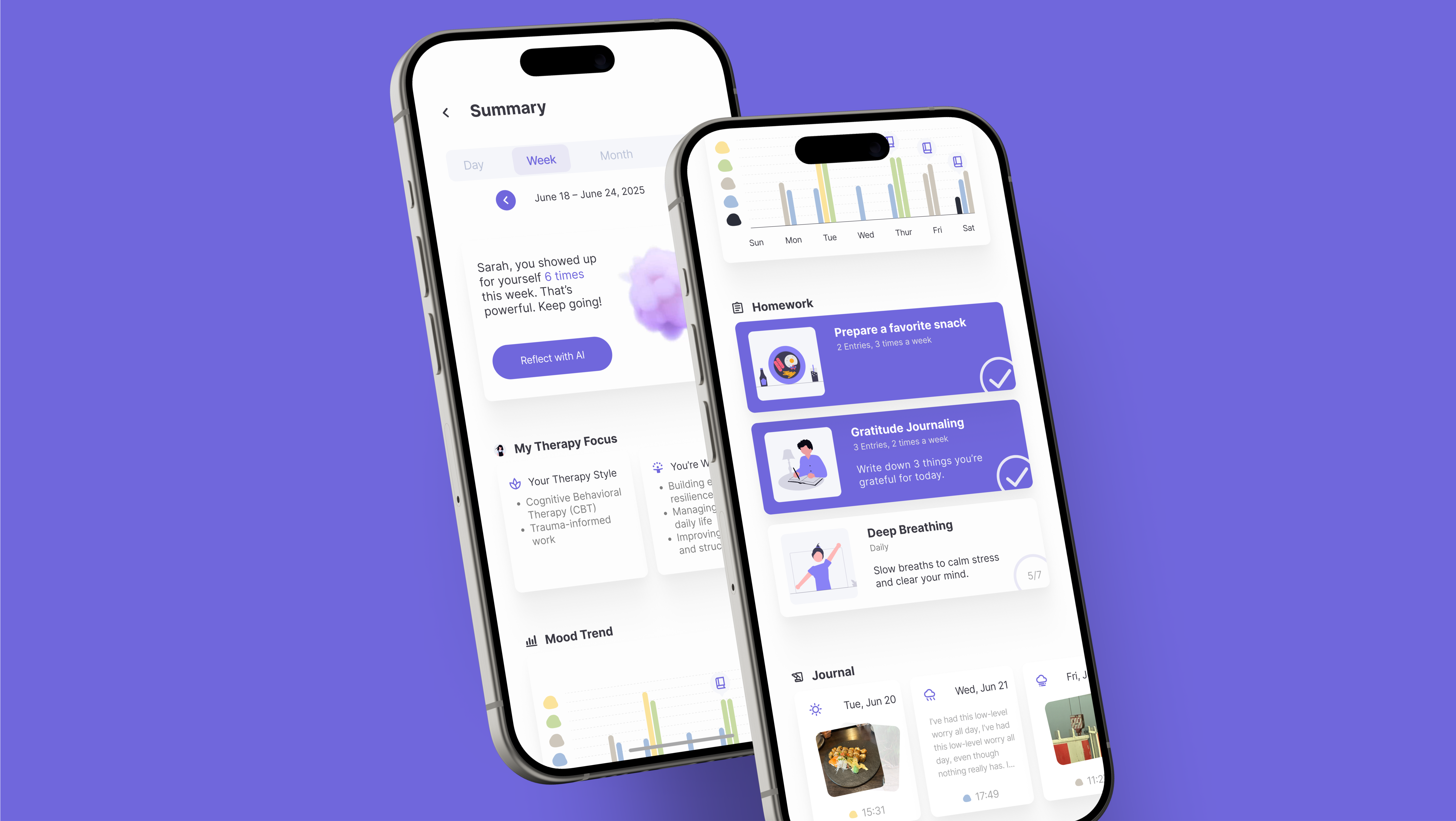 A weekly summary compiles mood trends, completed homework, and journal reflections to provide an insightful overview of progress. Both therapists and people seeking support can use this summary to stay informed and aligned on goals between sessions. This helps maintain momentum and highlights areas needing attention.