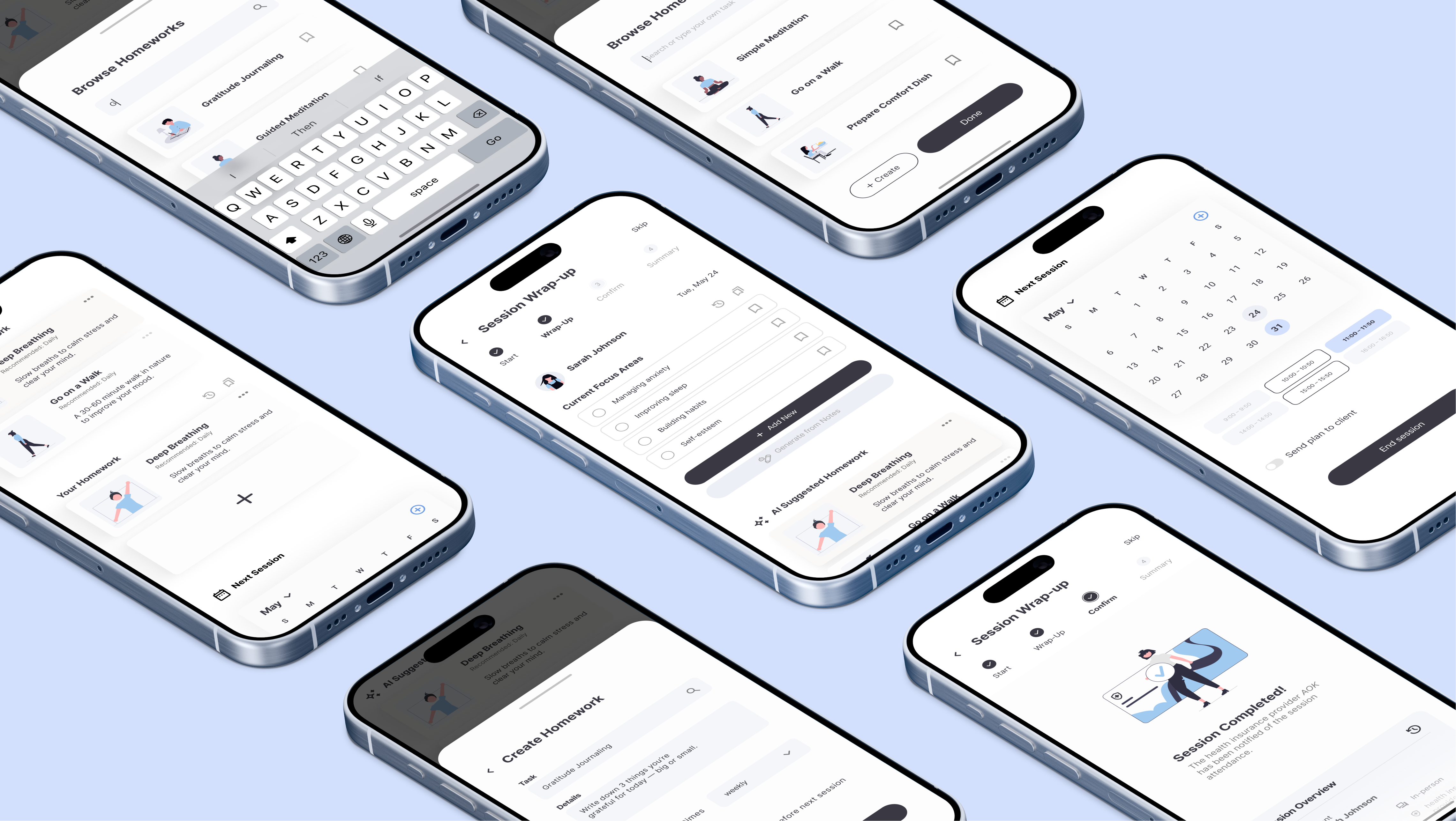 At the end of each session, therapist and client review the goals together, assign homework either from a ready-made collection or custom-made by the therapist, and schedule the next appointment. This shared process helps make everything clear and keeps therapy on track.