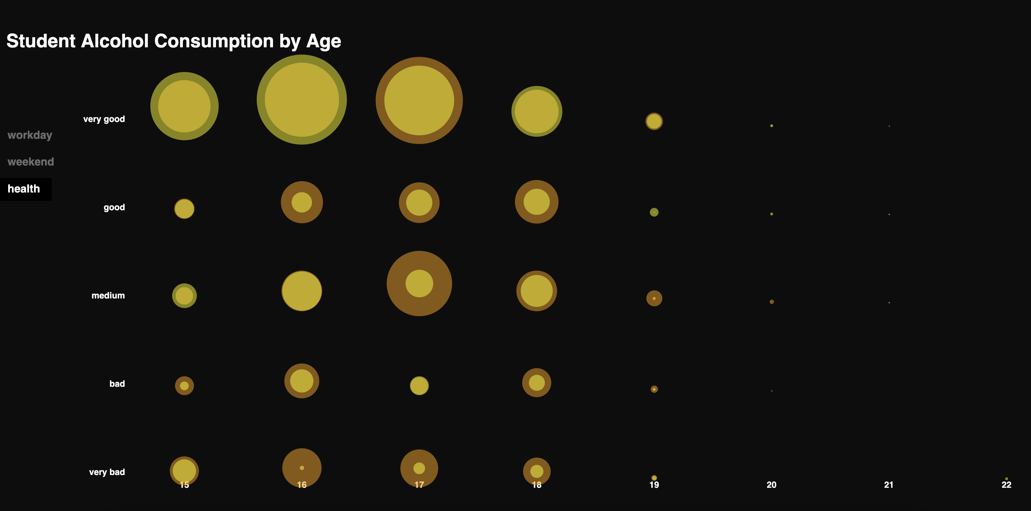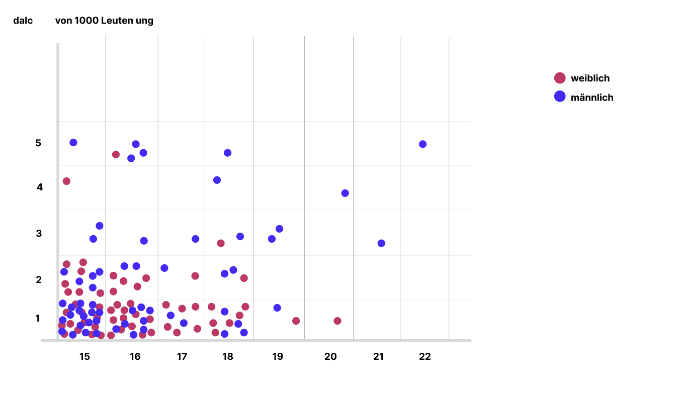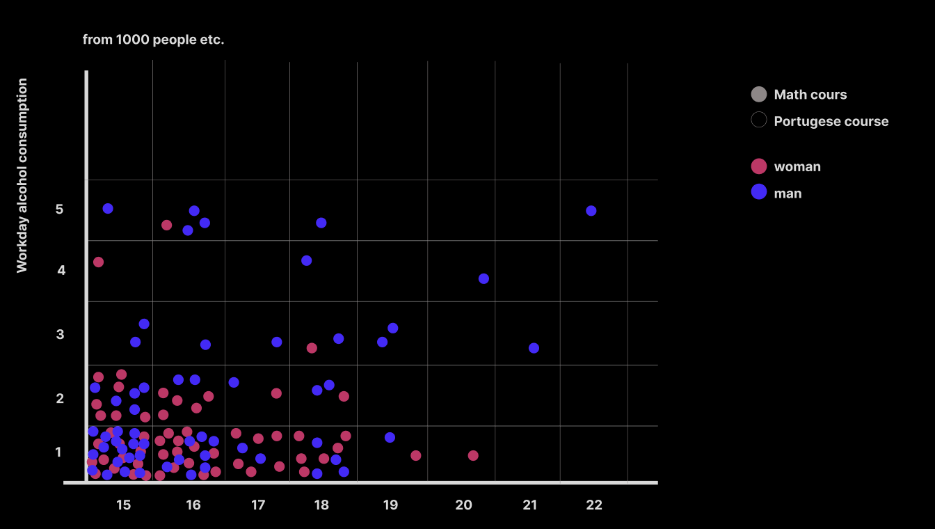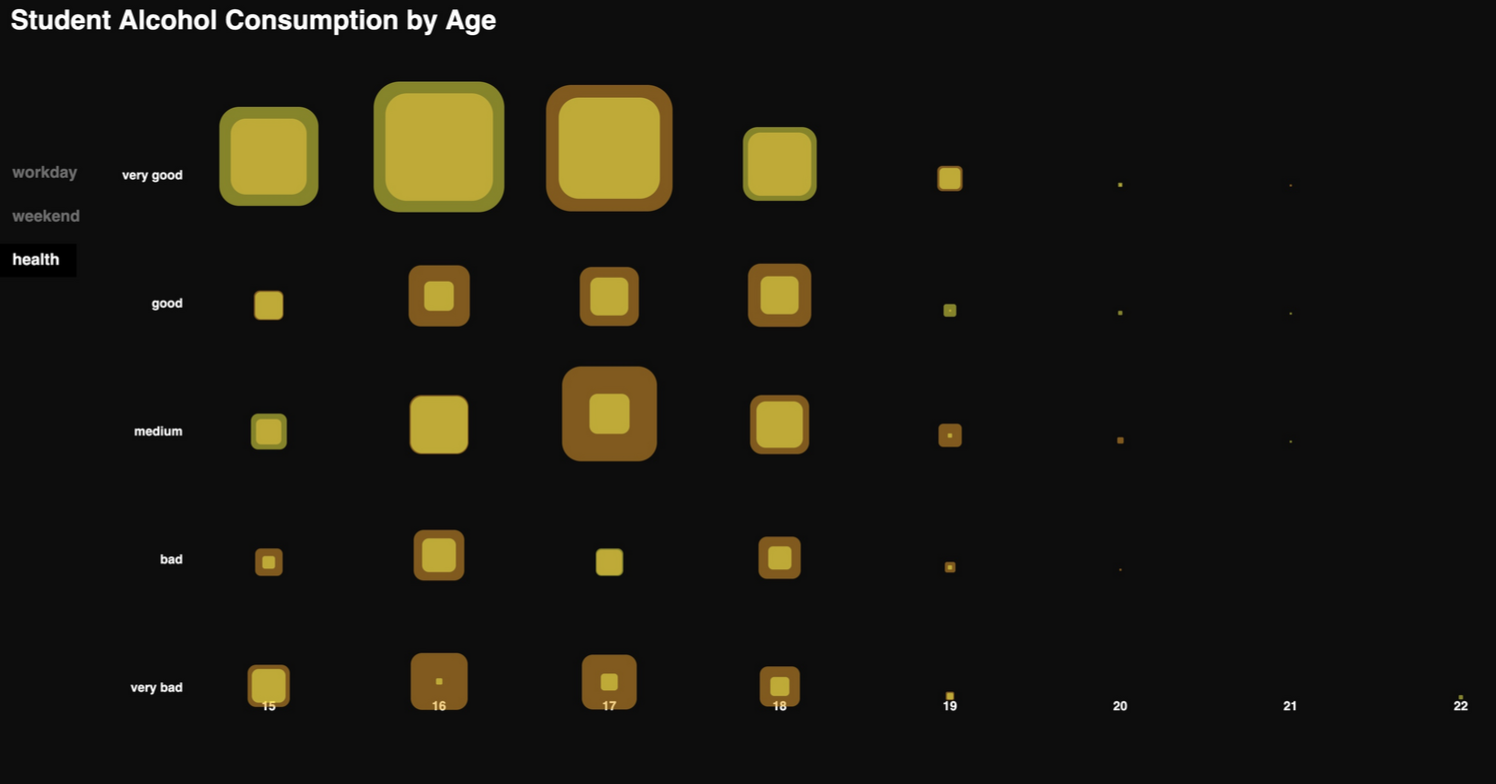 Die Visualisierung zeigt den Alkoholkonsum von Schüler:innen an einer Schule in Portugal. Grundlage ist eine Umfrage zu Konsumverhalten sowie sozialen und schulischen Faktoren. Ziel war es, Zusammenhänge zwischen Alkohol und Lebensumständen zu erkennen.