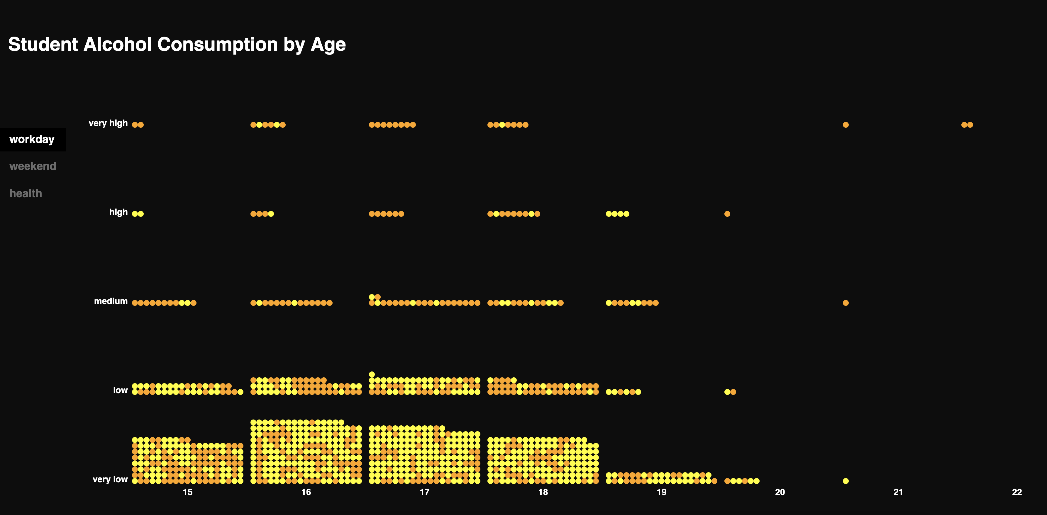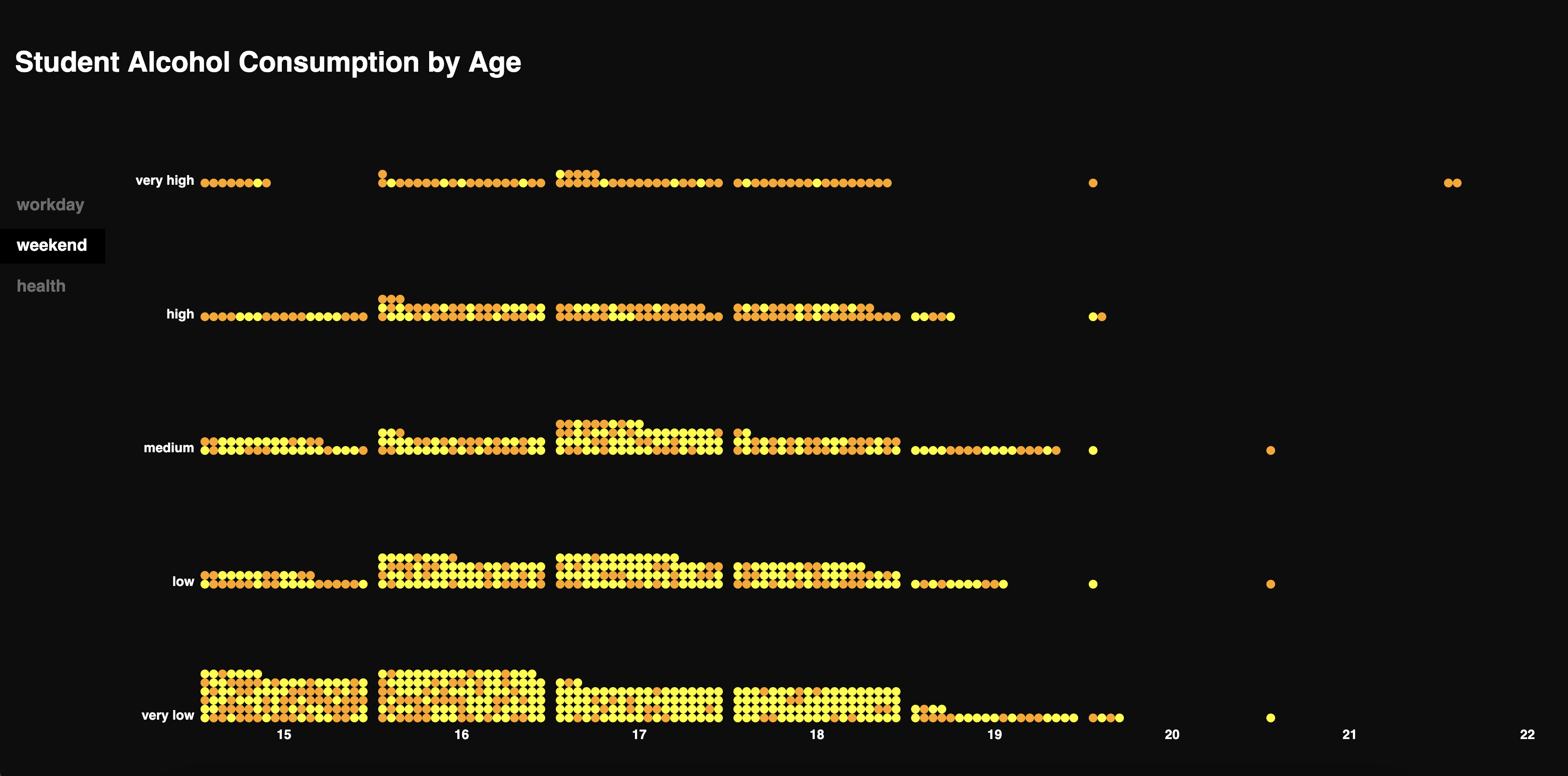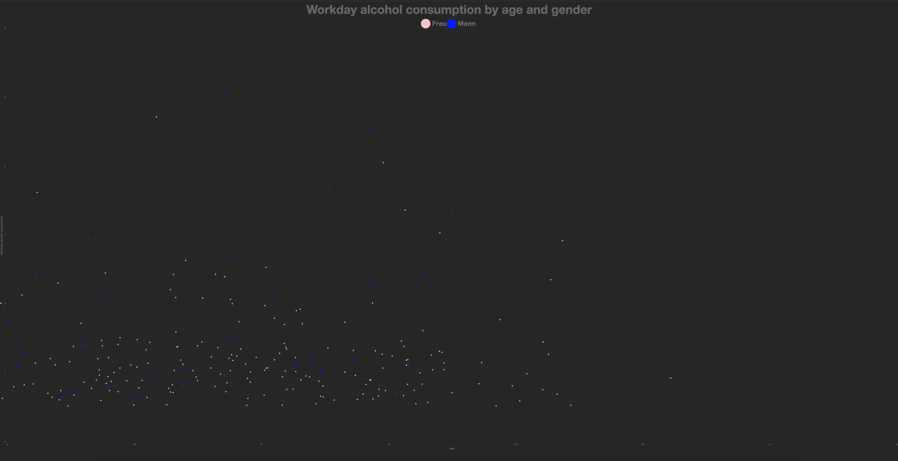 Die Visualisierung zeigt den Alkoholkonsum von Schüler:innen an einer Schule in Portugal. Grundlage ist eine Umfrage zu Konsumverhalten sowie sozialen und schulischen Faktoren. Ziel war es, Zusammenhänge zwischen Alkohol und Lebensumständen zu erkennen.
