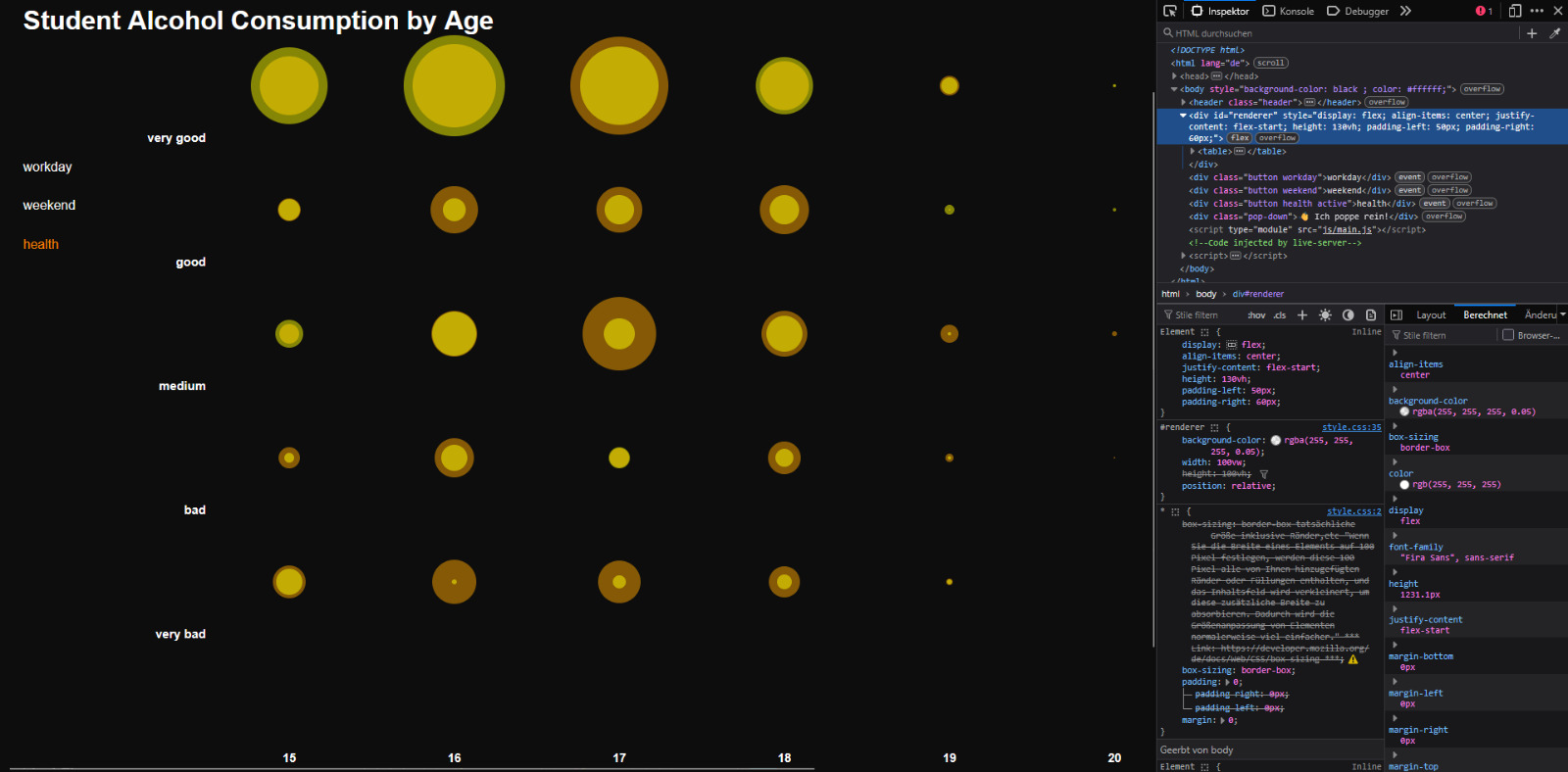 Nachdem das visuelle Konzept festgelegt war, begann ich mit der Programmierung. Die Daten wurden so strukturiert, dass sie den Zellen im Raster korrekt zugeordnet werden konnten. Sie visualisieren die Häufigkeit des Alkoholkonsums nach Geschlecht und Altersgruppe.