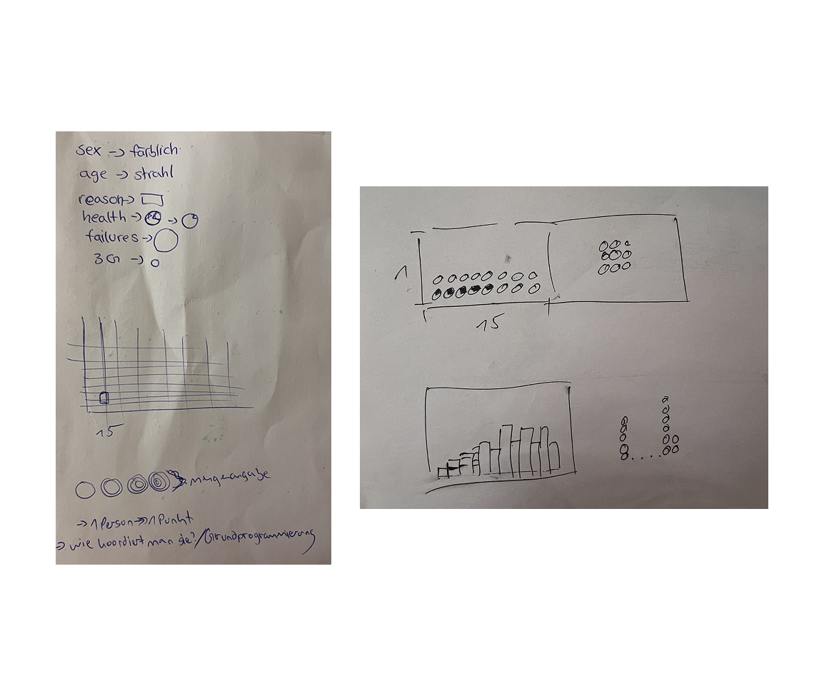 Zu Beginn wurden verschiedene Diagrammtypen ausprobiert, darunter Balkendiagramme, Kreisdiagramme, Linienverläufe sowie interaktive und animierte Varianten. Ziel war es, eine Darstellungsform zu finden, die die Komplexität der Daten strukturiert und gleichzeitig zugänglich vermittelt.