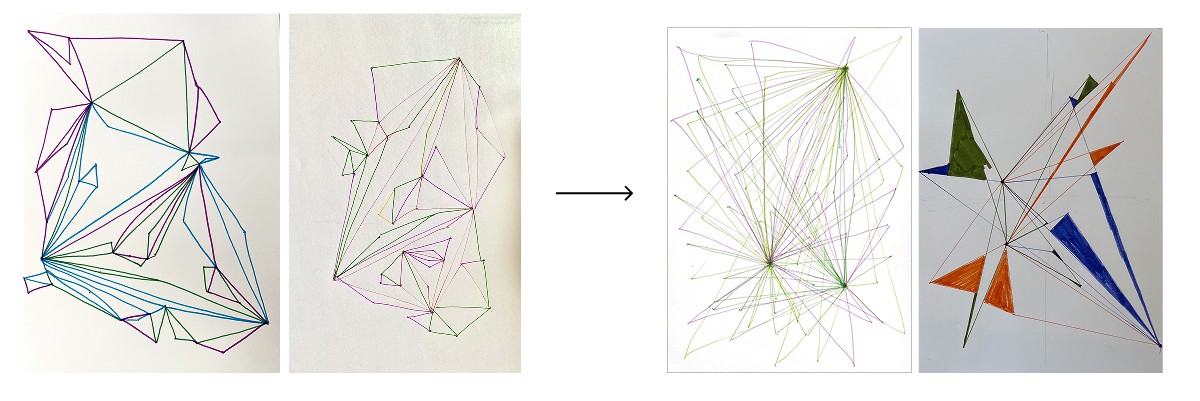Im Verlauf des Prozesses stellten wir uns jedoch die Frage: Warum nicht die Regeln etwas abwandeln? So entschieden wir uns, die Verbindung auf nur zwei Linien zu reduzieren. Dadurch entstanden keine geschlossenen, sondern offene Dreiecke. Eine visuelle Struktur, die uns gestalterisch mehr überzeugte und die wir im weiteren Verlauf gezielt weiterverfolgten.