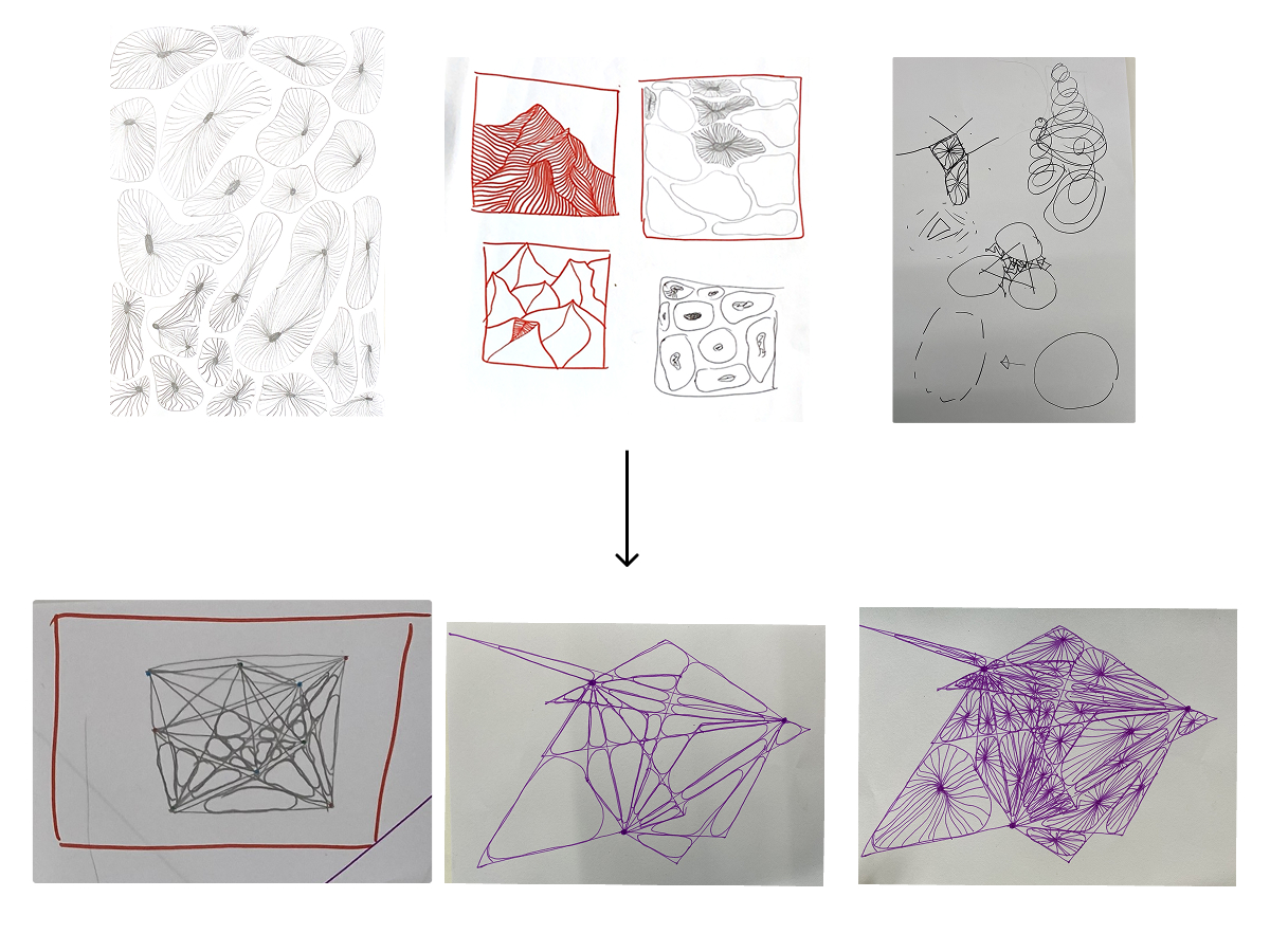 Zusätzlich untersuchten wir, ob und wie sich die Anzahl der Durchläufe auf die gestalterische Wirkung der Komposition auswirkt. So konnten wir herausfinden, wie sich durch Struktur, Wiederholung und offene Formen spannende Bildwirkungen ergeben – und genau damit wollten wir dann auch weiter gestalten.