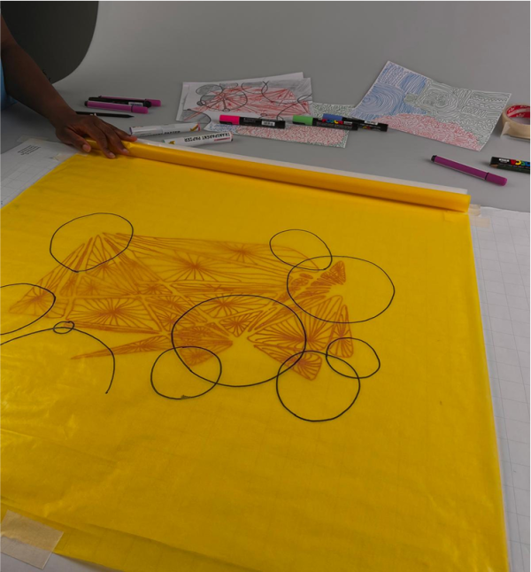 Wir begannen alle in der Mitte des Blattes und arbeiteten uns von dort aus in unterschiedliche Richtungen vor. Je weniger Platz auf dem Blatt übrig blieb, desto vorsichtiger mussten wir agieren, um nicht mit den Linien der anderen in Berührung zu kommen oder sie versehentlich zu schneiden.
