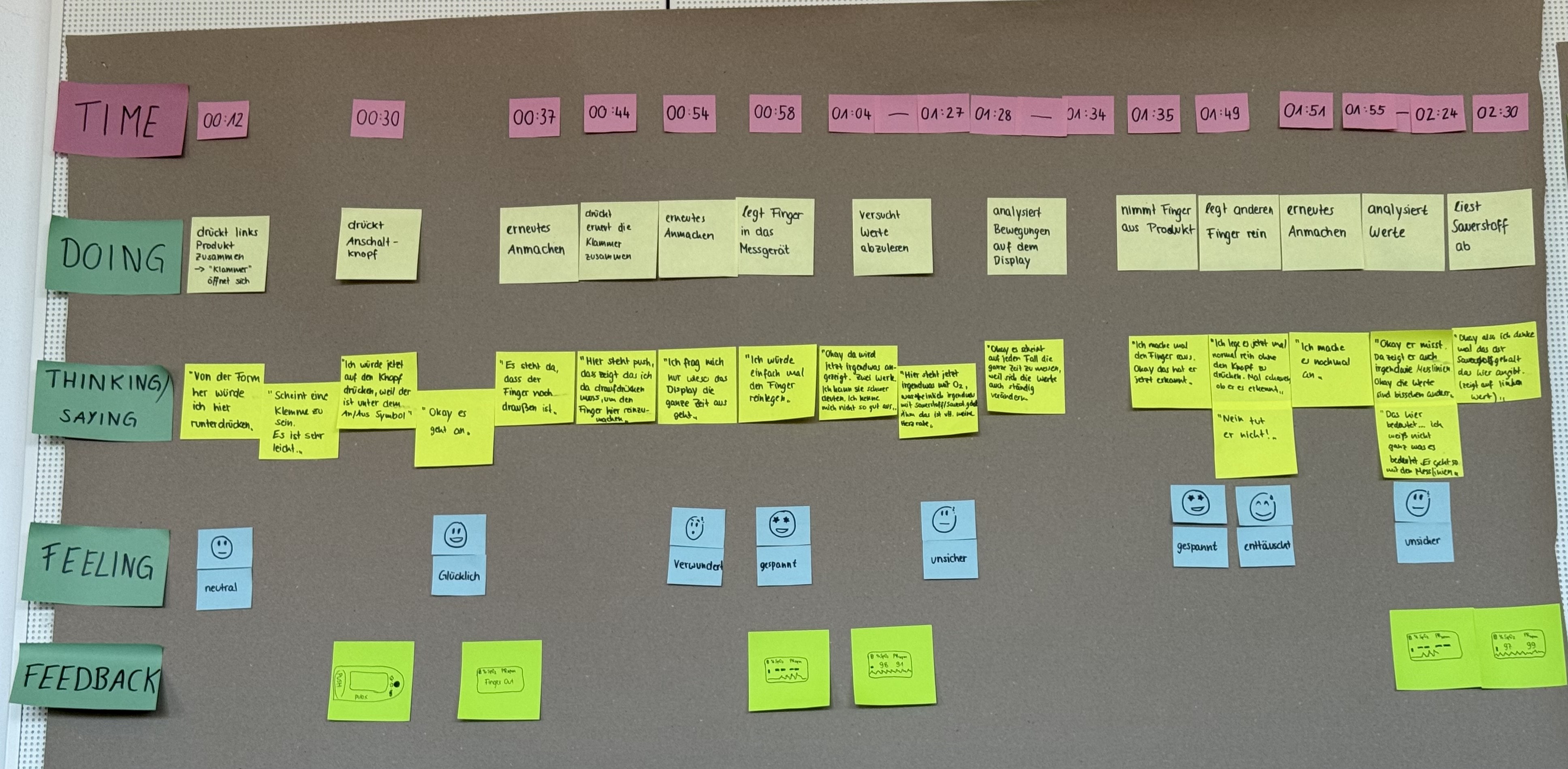 Im Projekt wurde ein First Use Test mit einem Pulsoximeter durchgeführt, bei dem eine unerfahrene Testperson ihre Sauerstoffsättigung selbstständig messen sollte. Das Nutzungserlebnis sowie mögliche Herausforderungen wurden dokumentiert und die zentralen Erkenntnisse anschließend anschaulich auf einem Plakat zusammengefasst.