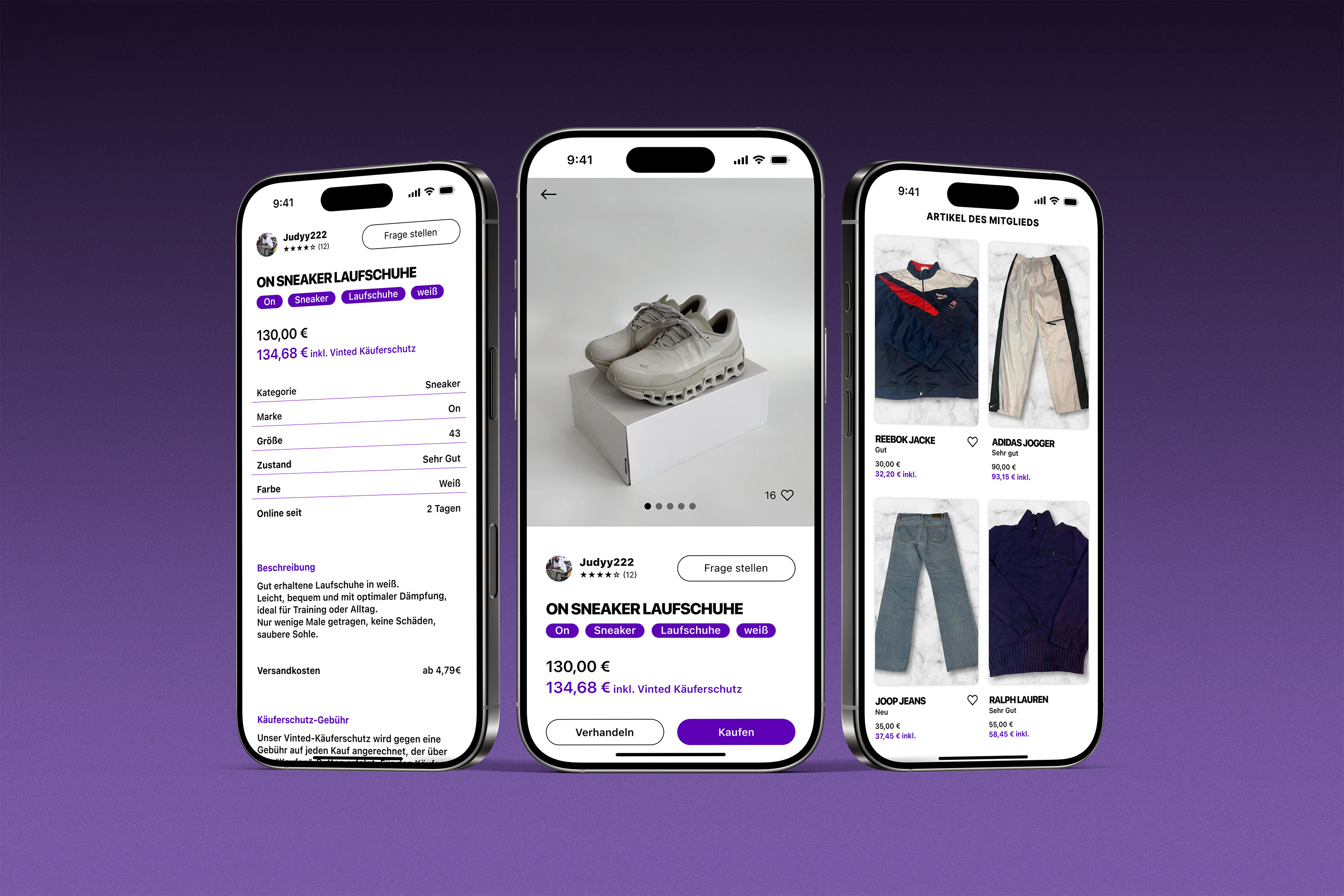 Die Inseratsansicht bietet Nutzerinnen und Nutzern einen detaillierten Einblick in das jeweilige Produkt. Oben stehen die Produktbilder im Fokus, die sich bequem nach rechts und links swipen lassen, um verschiedene Perspektiven zu sehen. Direkt darunter erscheint das Profil der Verkäuferin oder des Verkäufers samt Name, Bewertung und einer Möglichkeit, unkompliziert Fragen zu stellen. Der Titel des Inserats sowie passende, klickbare Tags folgen – so können ähnliche Produkte leicht über die Tag-Filter entdeckt werden. Im Anschluss werden der Preis und der Preis inklusive Vinted-Käuferschutz transparent dargestellt. Weitere Informationen wie Kategorie, Größe und Zustand sind übersichtlich aufbereitet. Am unteren Ende der Ansicht finden sich zusätzliche Angebote derselben Verkäuferin oder desselben Verkäufers, wodurch das Stöbern im gesamten Sortiment erleichtert wird.