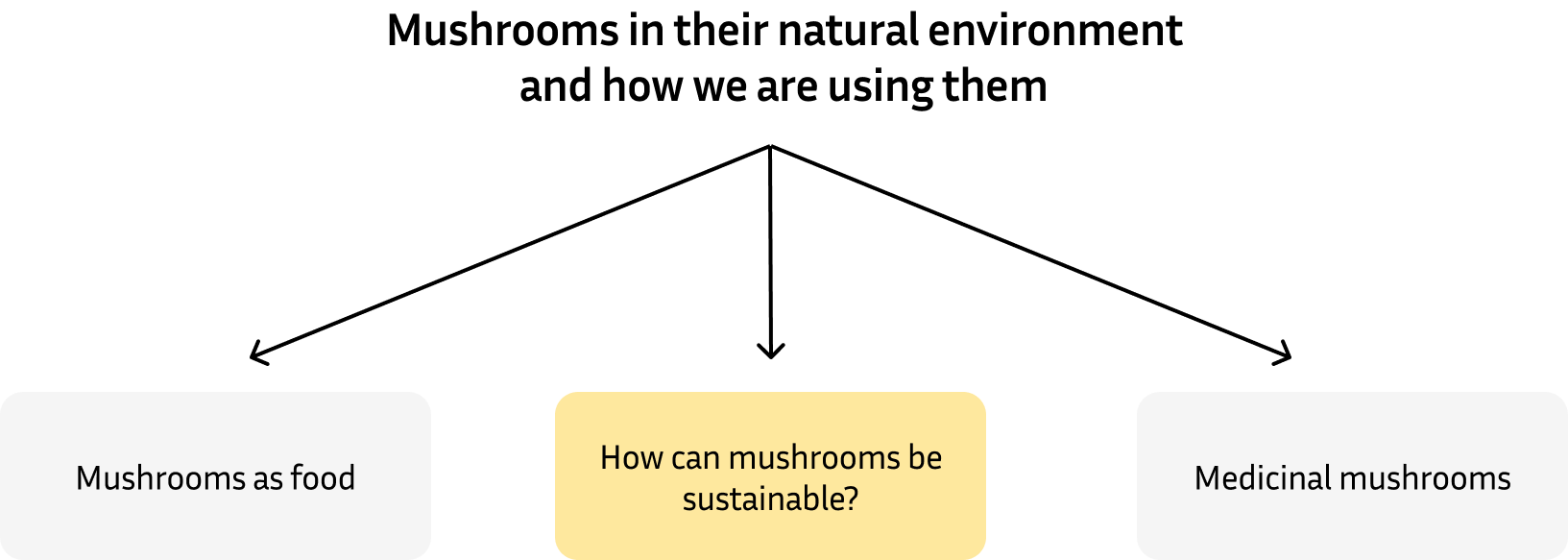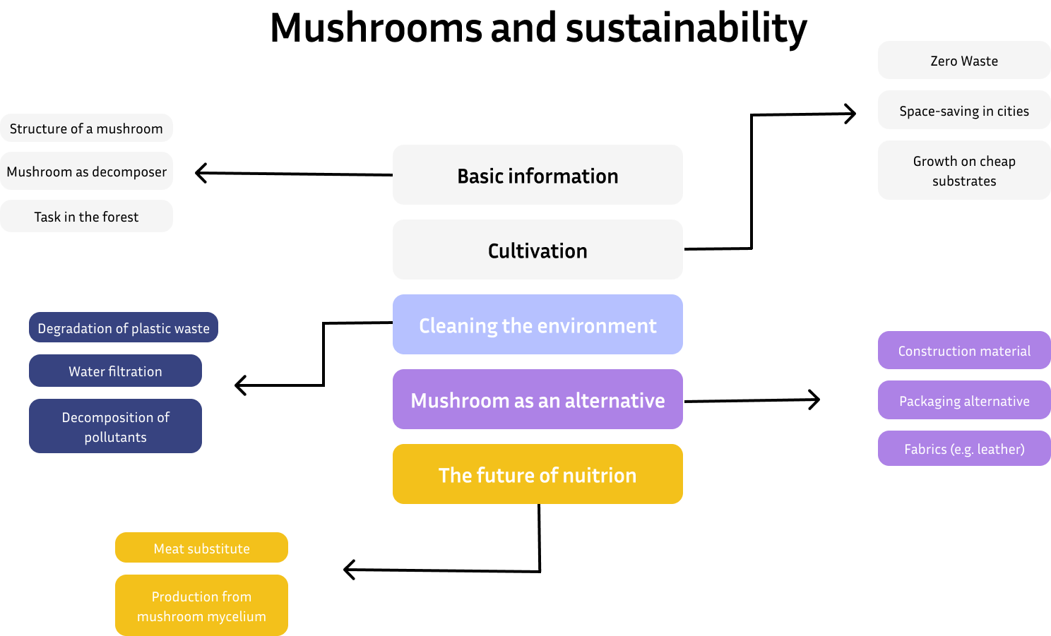 Zu Beginn wurden uns zwei Themen aus einem Lexikon zugelost, aus denen wir eines auswählen sollten. Wir entschieden uns als Gruppe für das Thema Pilze, da uns die Verbindung zu Natur und Nachhaltigkeit besonders angesprochen hat. Unser Ziel war es, ein interaktives System zu entwickeln, das die Vielseitigkeit von Pilzen zeigt und deren mögliche zukünftige Nutzung auf verständliche und visuell ansprechende Weise vermittelt.