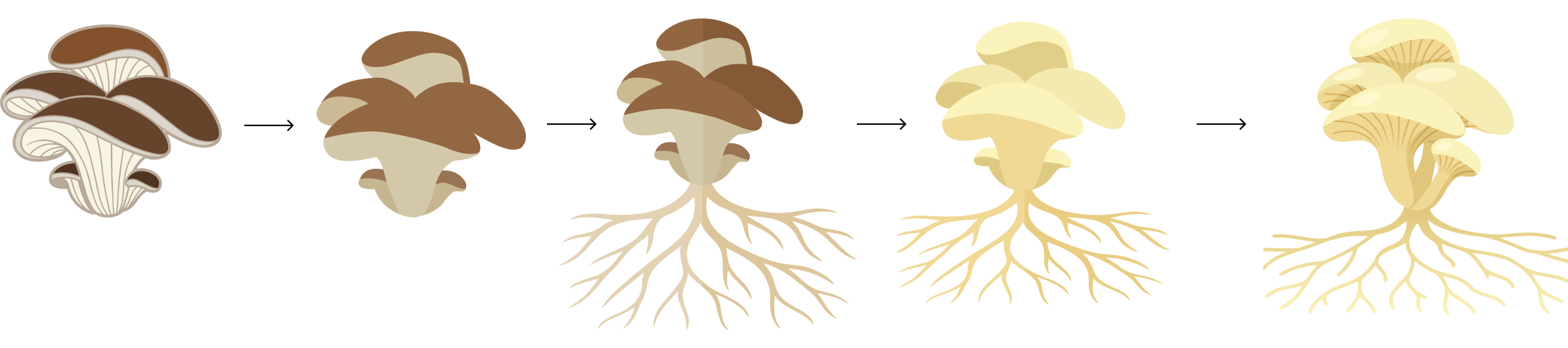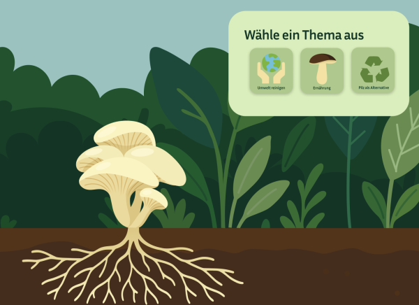 Ein zentrales Element unseres visuellen Konzepts war die Gestaltung eines Pilzmotivs, das sich durch das gesamte Informationsmodul zieht. Wir haben uns bewusst für den Austernpilz entschieden, da er zu den wenigen Pilzarten gehört, die Lignin abbauen können.