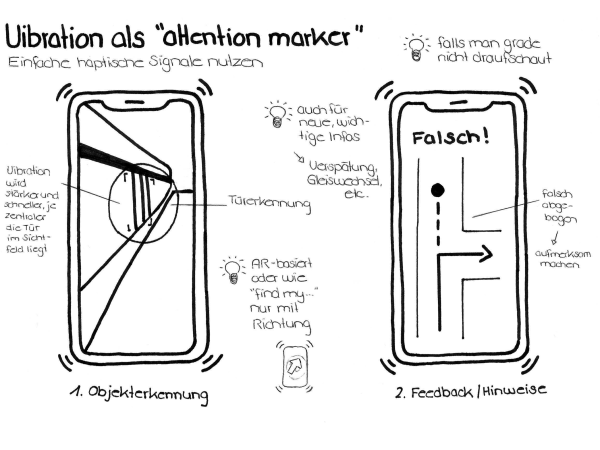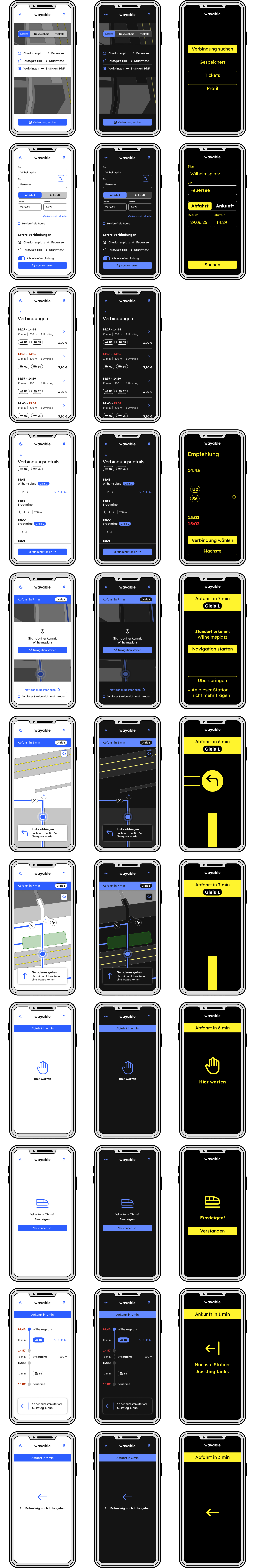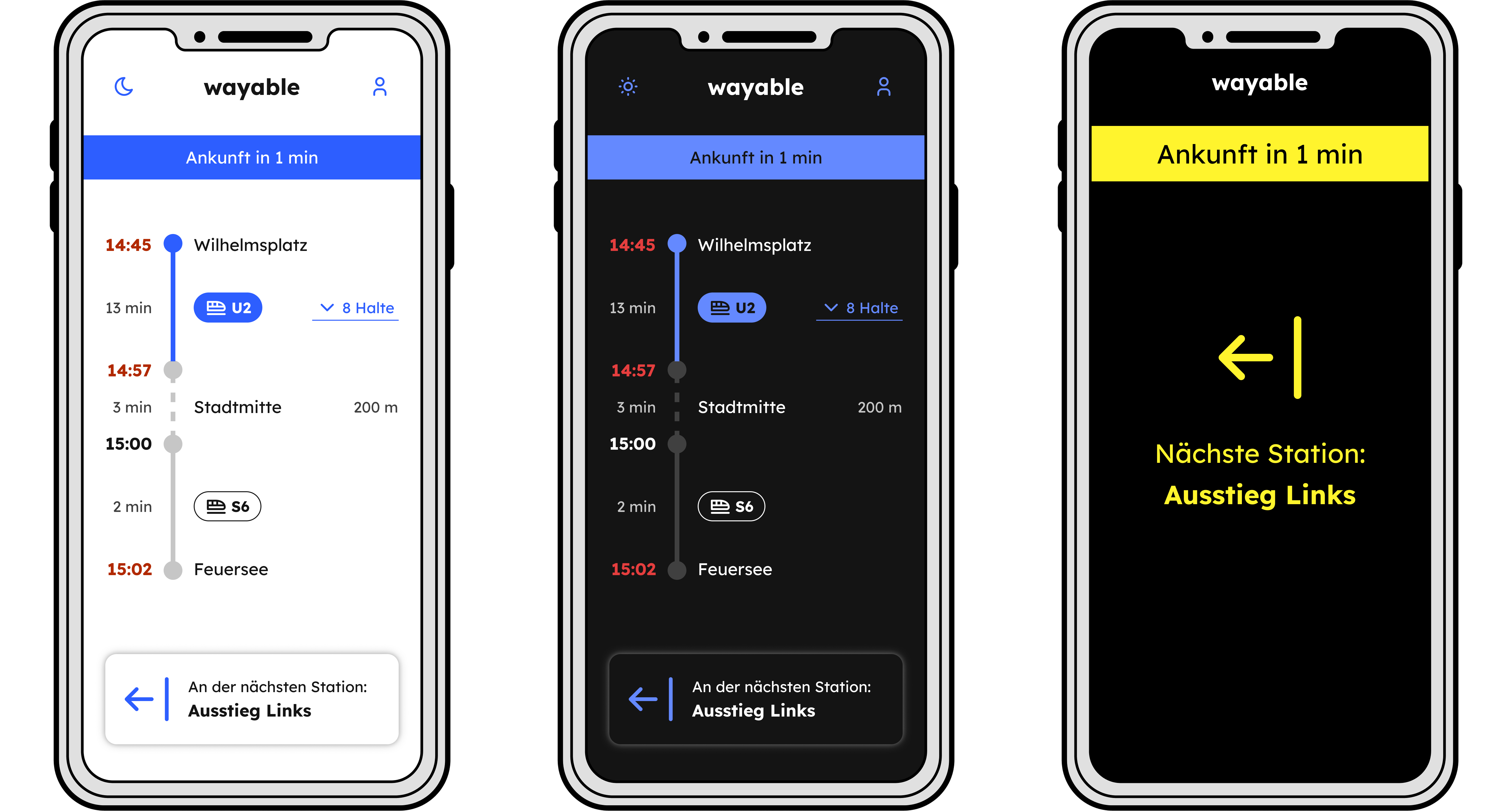 Eine Anwendung für Planung, Orientierung und Navigation im ÖPNV. Sie wurde nach den Prinzipien des Universal Design entwickelt - mit einem besonderen Fokus auf Menschen mit Seheinschränkungen. Informationen werden multimodal vermittelt: Visuell, auditiv und taktil. Ziel ist es, auch in komplexen Umgebungen einen guten Überblick zu schaffen und die Nutzer:innen sicher ans Ziel zu bringen - klar, fokussiert und barrierefrei.