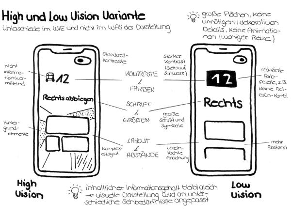 Optimierung der Anwendung für Menschen mit Seheinschränkungen: Darstellungen werden auf das Wesentliche reduziert. Hohe Kontraste, große Typographie, klare Hierarchien und kleinschrittige Interaktionen erleichtern die Nutzung.