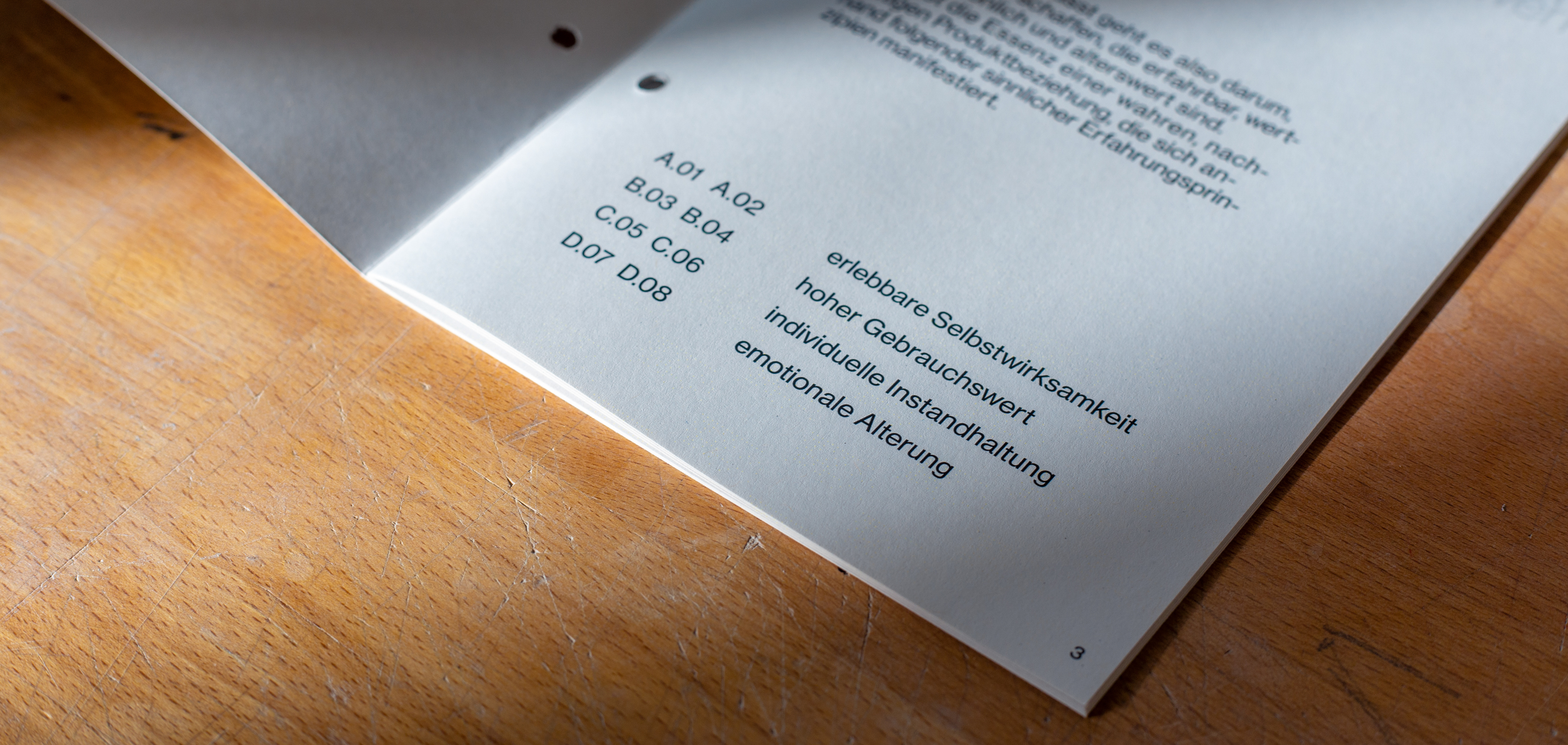 Dieses Regelwerk basiert auf vier sinnlichen Prinzipien, die jeweils eine andere Facette der Produkt-Nutzer-Beziehung beleuchten: erlebbare Selbstwirksamkeit, hoher Gebrauchswert, individuelle Instandhaltung und emotionale Alterung. Sie bilden den theoretischen Rahmen, der durch ein demonstratives Produkt und eine interaktive Inszenierung in die Praxis überführt wird.