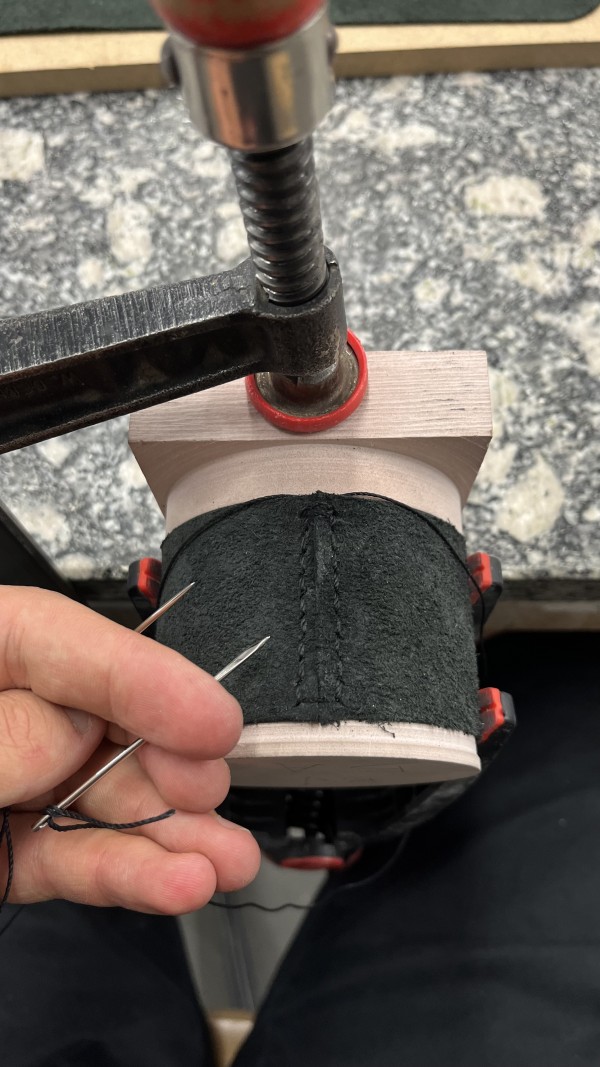 Das Design der Mokka besitzt keinen klassischen Griff. Stattdessen kommt ein genähter Lederriemen zum Einsatz, der von unten über die Kanne geschoben wird und in einer vorgesehenen Nut sicher sitzt. Die obere Partie der Kanne ist bewusst dickwandiger gestaltet als der untere Kessel – das schafft sowohl funktionale Stabilität als auch eine haptische Trennung.