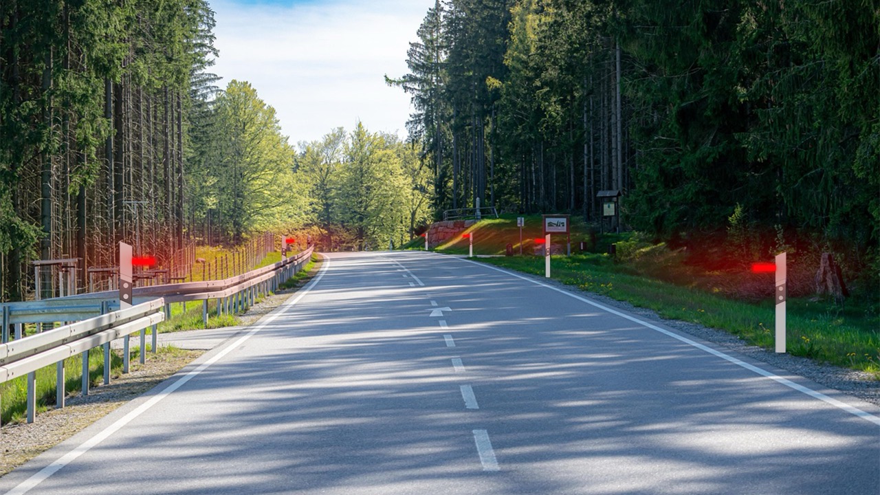 Bei der Erkennung eines Wildtiers wird eine physische Warnschranke aktiviert. Diese fährt bei den umliegenden Pollern aus und ist mit reflektierenden Elementen ausgestattet. Ein roter, horizontaler Balken macht die Warnung bei Tag und Nacht deutlich sichtbar. Das System funktioniert unabhängig von Fahrzeugmodellen oder deren Ausstattung – jedes Auto kann die Warnung erkennen.