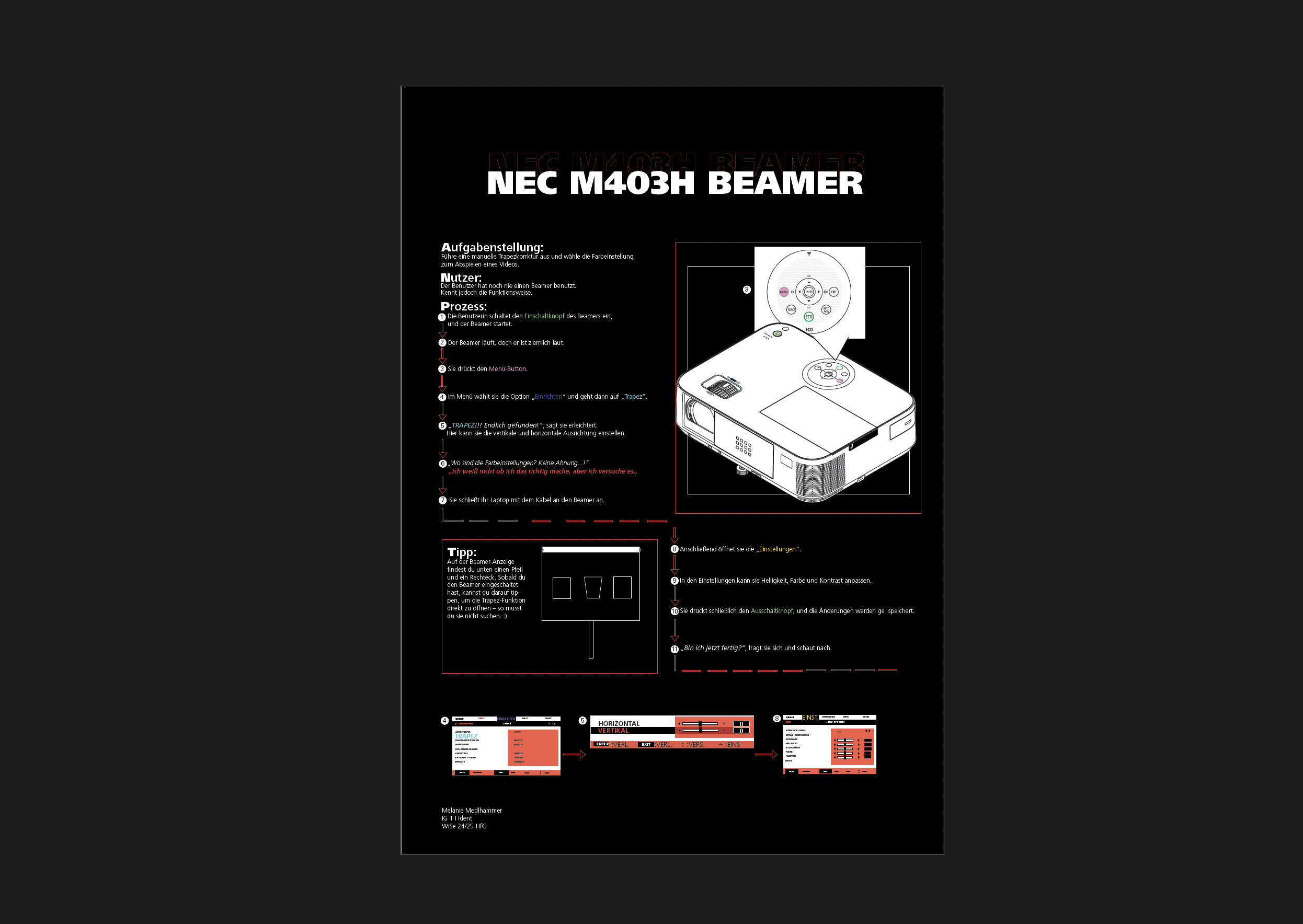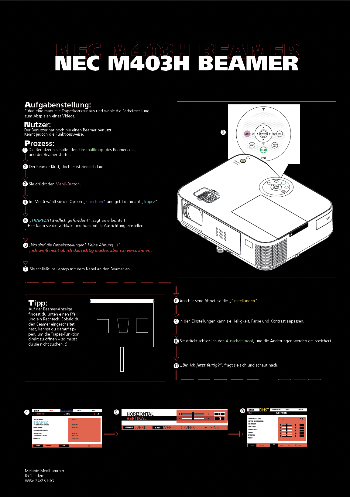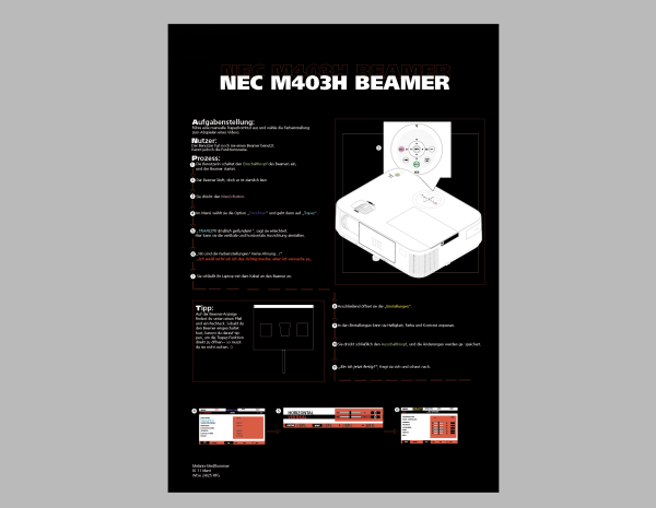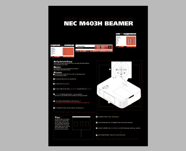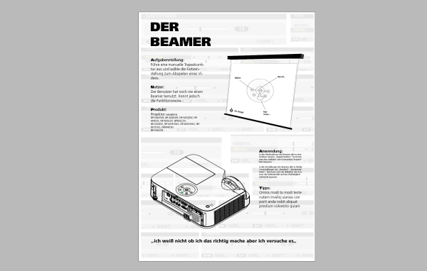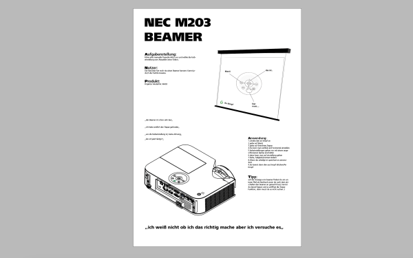 Im Rahmen des Kurses IDENT haben wir einen Nutzertest (First-Us) für ein Insights-Poster durchgeführt. Bei meinem ersten Nutzertest durfte ein Kommilitone den Beamer ausprobieren. Das Poster enthält wichtige Erkenntnisse und Benutzererfahrungen, die während des ersten Tests erfasst wurden. Anschließend wurde eine Interaction Map basierend auf den Ergebnissen des Tests erstellt. Mein Kommilitone, der den Beamer benutzte, meinte beim ersten Versuch: „Ich weiß nicht, ob ich das richtig mache, aber ich versuche es.“