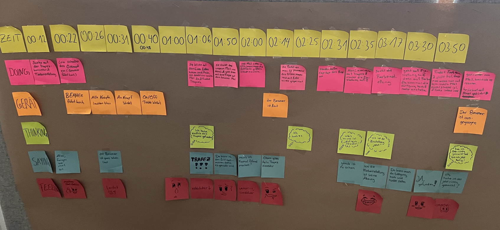 Die gesammelten Erkenntnisse aus dem User Test wurden nun detailliert auf einer Map festgehalten. Ich habe die Informationen in folgende Kategorien unterteilt “doing”, “thinking”, “feeling”, “saying”, “device”.