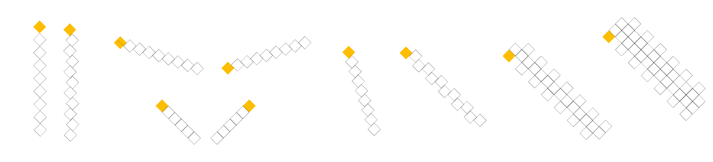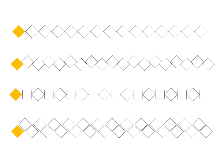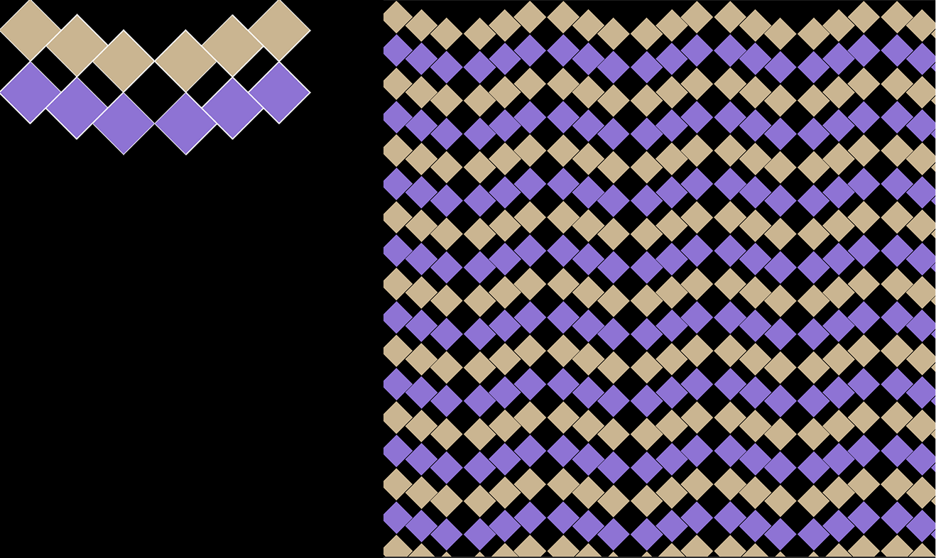 Der Aufbau dieser Parkettierung funktioniert folgendermaßen: Zunächst wird an einer seitlichen Ecke eine Reihe von Rauten aneinandergereiht, wobei jede zweite Raute um einen bestimmten Wert nach oben verschoben wird. Danach wird die gesamte Reihe nach links versetzt, sodass jede Form an der benachbarten ansetzt und ein „Hoch-Runter“-Effekt entsteht. Die nächste Raute setzt dabei immer um die Hälfte der vorherigen an. Um die gewünschte Fläche zu erzeugen, wird dieselbe Reihung an den unteren Eckpunkten der Rauten angesetzt. Anschließend wird der gesamte Satz der Reihung erneut nach links verschoben und so weit nach oben gesetzt, dass alle Formen sich berühren. Eine weitere Reihung dieses Musters wird dann versetzt unter die vorherige gesetzt.