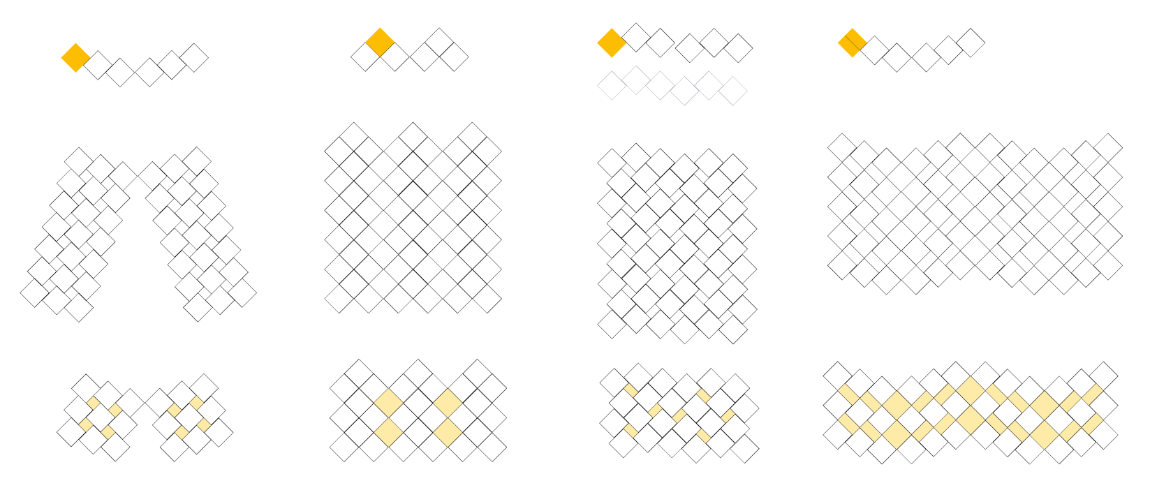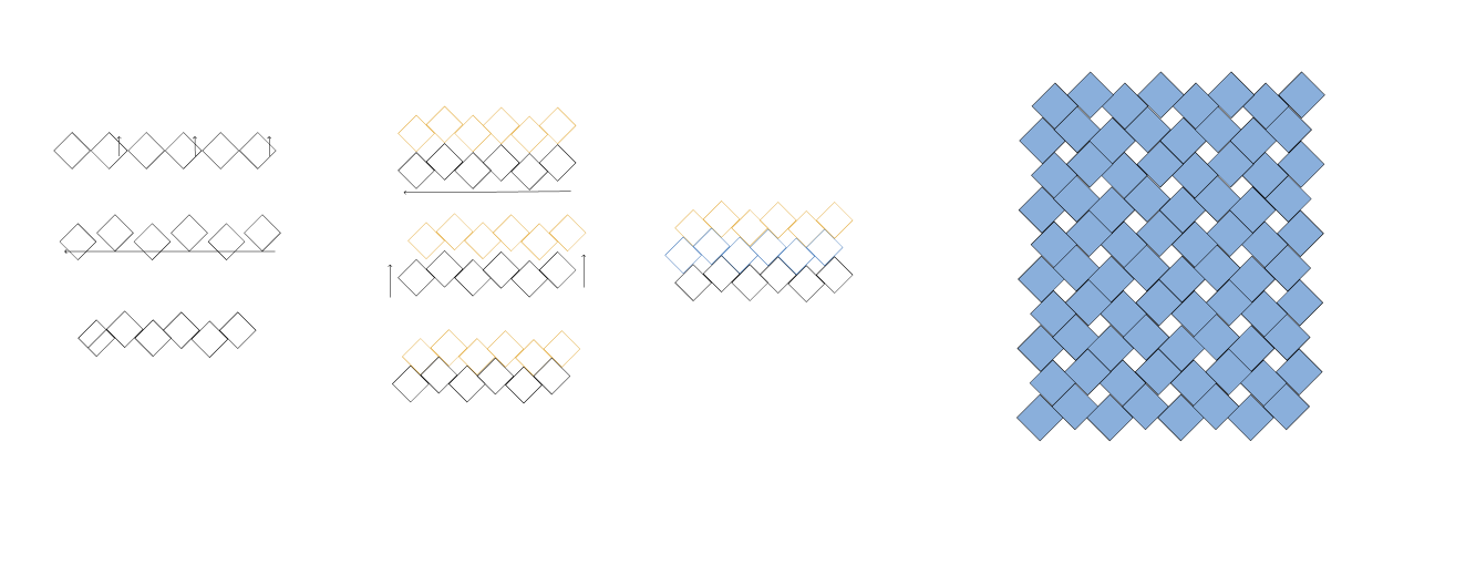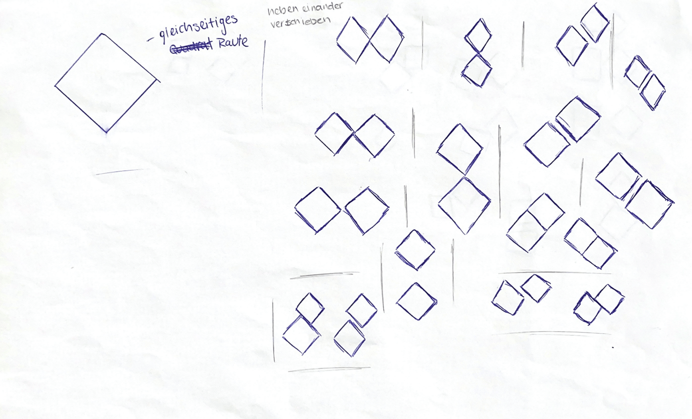 Daraufhin ging es darum, von einzelnen Reihungen in die Fläche zu denken. Bei der gleichseitigen Raute stellte sich für mich schnell die Frage, wie man die Aneinanderreihungen in vertikaler und horizontaler Richtung spannend und innovativ gestalten kann. Das reine Aneinandersetzen an den Spitzen oder entlang der gesamten Kante erschien mir wenig reizvoll. Deshalb experimentierte ich mit dynamischeren Anordnungen und kam zu der Erkenntnis, dass eine abwechselnde Verschiebung der einzelnen Formen sowie der gesamten Reihen in der horizontalen Ebene ein deutlich interessanteres Gesamtbild erzeugt. Dabei entstanden viele Hohlräume, die ich im späteren Prozess gezielt genutzt habe.