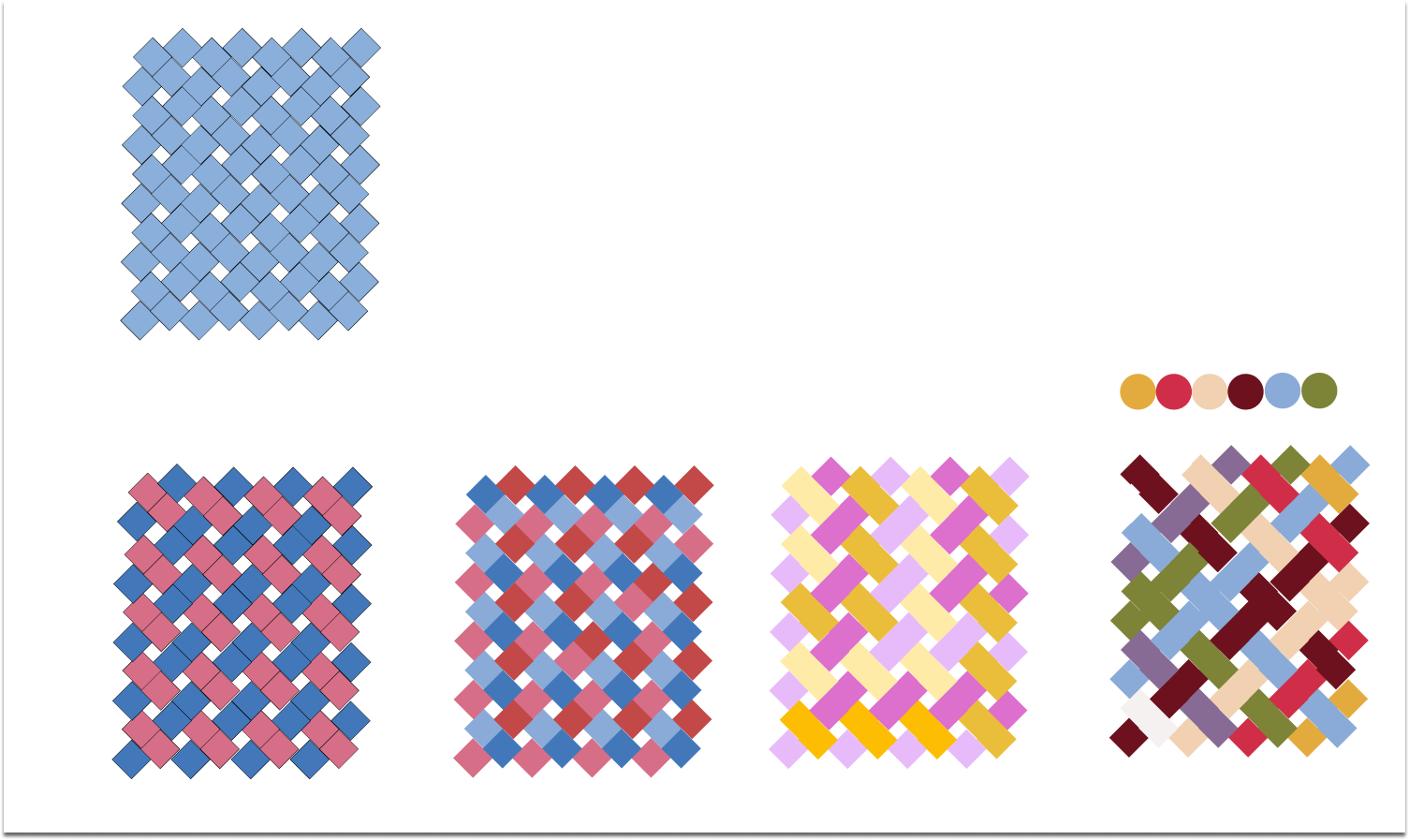 Im nächsten Schritt überlegte ich, welche farbliche Stimmung ich im Pattern erzeugen möchte. Dabei entstanden mehrere Varianten, deren Ziel es war, schrittweise mehr Farboptionen einzubringen und einen Effekt zu erzeugen, der zunächst simpel wirkt, sich dann aber zu komplexeren Farbwirbeln entwickelt. Am Ende entschied ich mich für die ersten drei Farbwechsel.