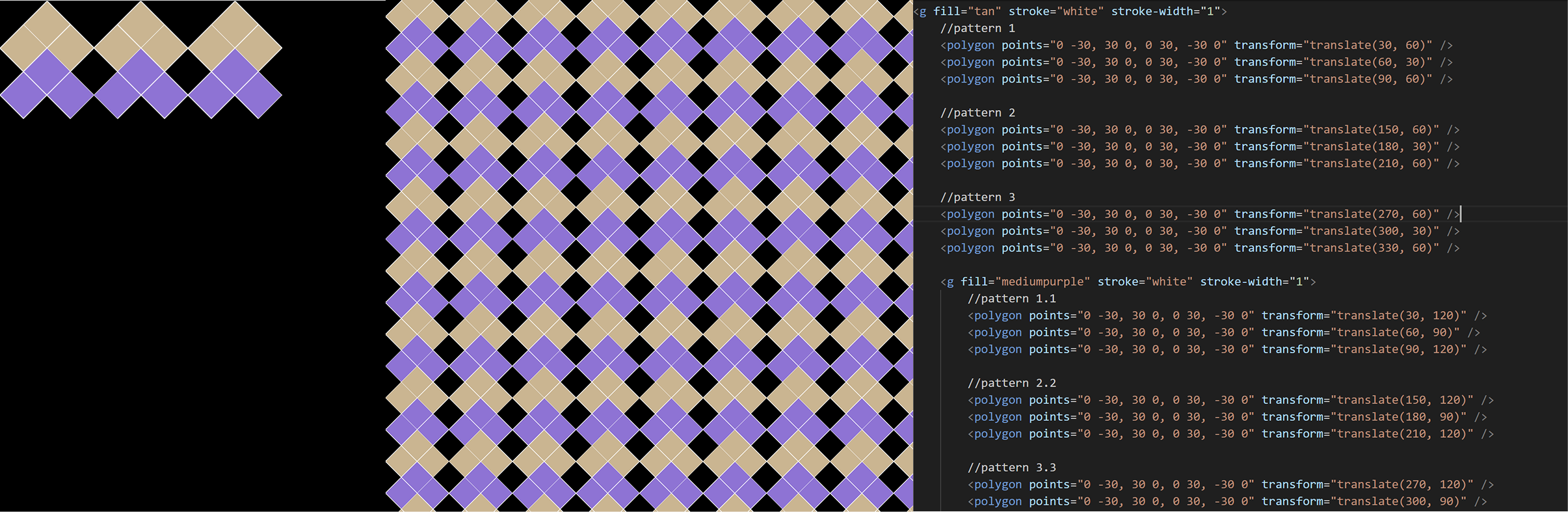 Für die programmierte Umsetzung habe ich zunächst meine bevorzugte Parkettierungsvariante im ersten Schritt teilweise „hardcodiert“, um ein Gefühl für den Aufbau zu bekommen. Das bedeutet, dass einige Werte direkt in den Code geschrieben wurden, statt sie flexibel zu generieren. Anschließend brachte ich diese Formen in Reihung, um das gesamte Feld zu füllen.