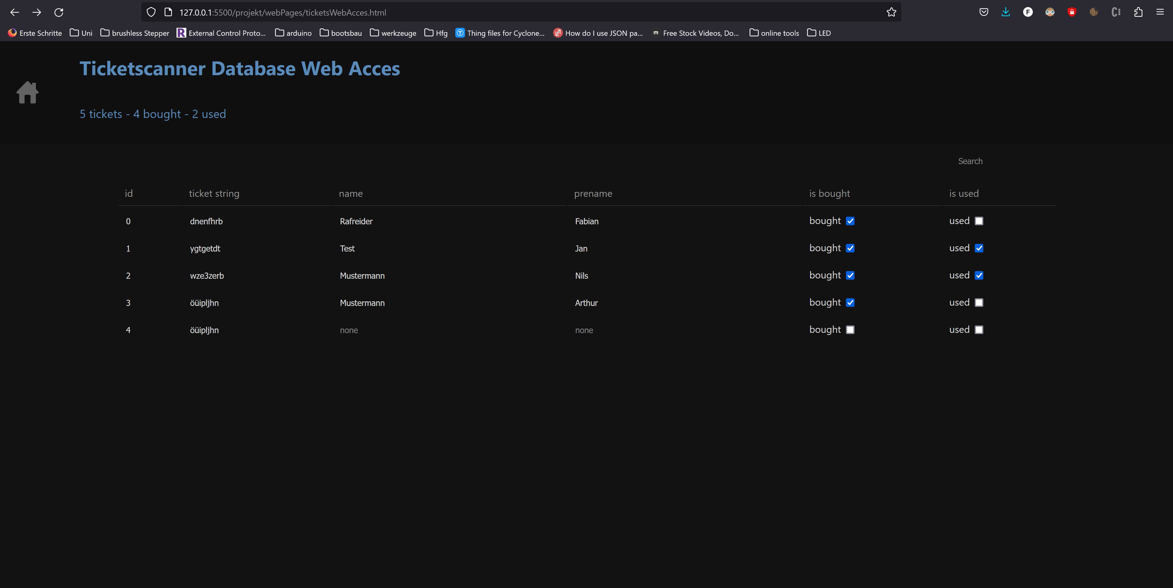 Die Letzte Website ist dafür da um alle Karten, mit allen Informationen und dem Aktuellen Kundenstatus einzusehen und zu überblicken. Hier können alle Tickets durchsucht und später auch korrigiert werden. Diese Seite soll hauptsächlich im falle eines Fehlers im Hinzufügungsprozesses oder der Validierung zu möglichst einfacher korrektur führen.