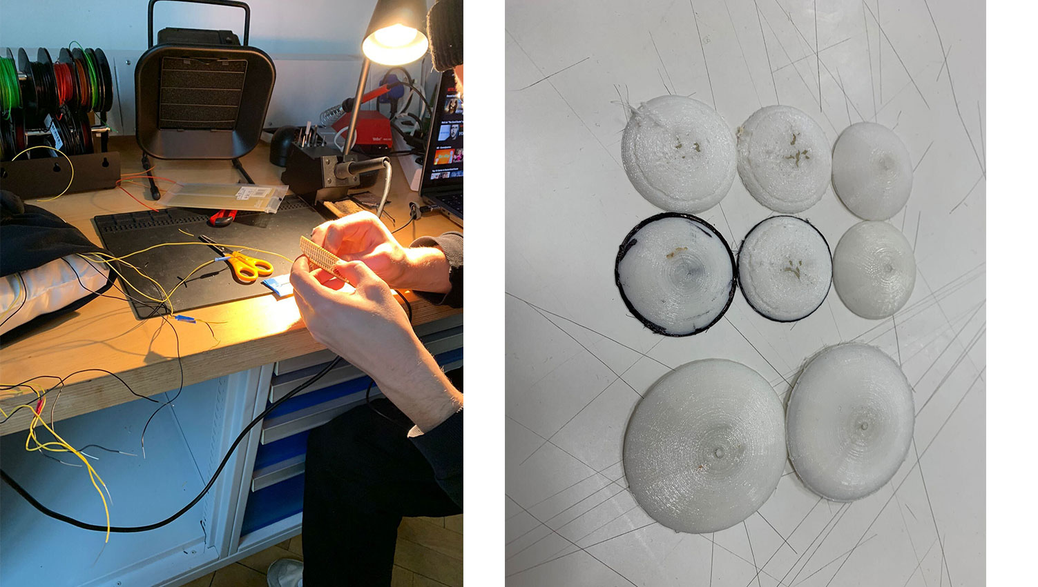 erste Lötversuche und gedruckte Buttonstechnischer Stand beim Usertesting und Reißverschluss