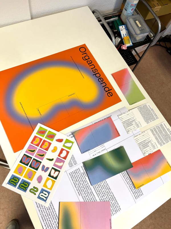 Gestalterisch haben wir vor allem mit Organformen gearbeitet, die das Thema greifbar machen. Diese sollen möglichst weich und freundlich wirken, weswegen wir uns für einen Blur Effekt und warme Farben entschieden. Die Kontur um die Organe sorgt zusätzlich für eine Art Schutzgefühl, welches die Organisation vermitteln soll.