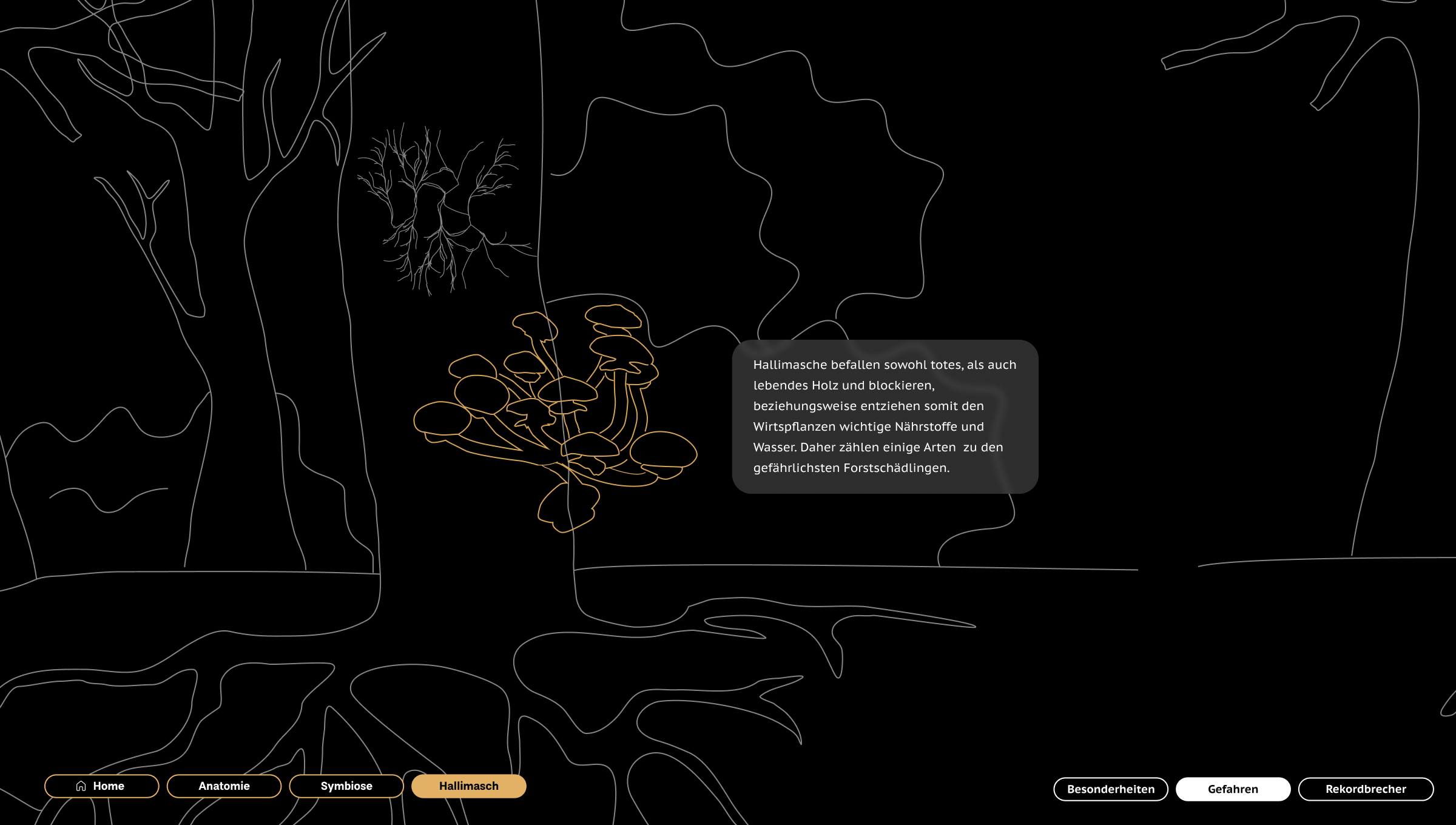 „Pilze – Der größte Organismus der Erde”. Der Fokus liegt hierbei insbesondere auf den Pilzen im Wald und dem Zusammenspiel mit anderen dort lebenden Organismen. Das Thema selbst wird mit Hilfe eines digitalen Exponats in Form von interaktiven Slides aufgegriffen und als Prototyp umgesetzt. Die Voraussetzung für den Bau dieses Prototypen bieten Beamer und ein Arduino Board, welches durch die Übertragung per Touchbefehle an einen angeschlossenen Laptop weiterleitet.