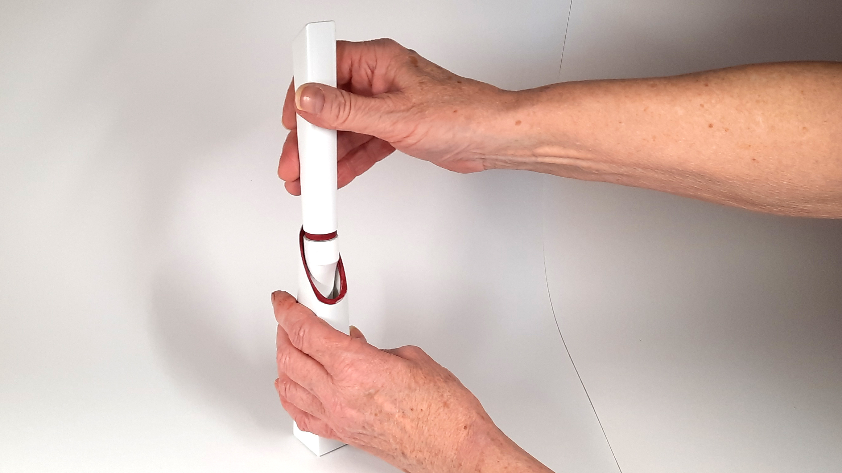 Auf das Ziehen wird dadurch hingewiesen, dass die Zahnbürste erhaben ist. Der Fuß steht sicher auf dem Waschbecken, da er konisch ist. Durch die rote Kante wird auf das Trennen von Bürste und Fuß hingewiesen. Da diese Kante so dezent in der Öffnung des Fußes ist, wird der Nutzer neugierig und möchte die Bürste herausnehmen.