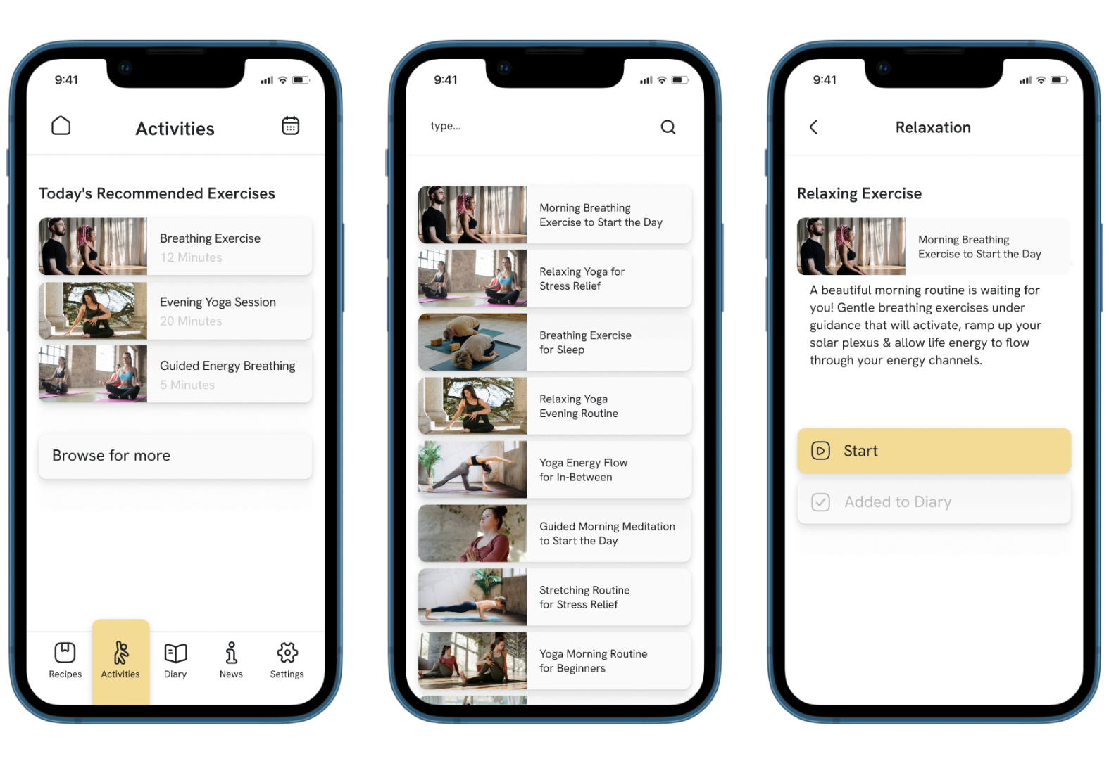 Nicht nur Ernährung spielt bei Unverträglichkeiten eine große Rolle, sondern auch die körperliche Betätigung. Das unterstützt die App durch Vorschläge von Workouts oder kurze Erinnerungen durch eine Nachricht. Hierbei gibt es unterschiedliche Arten von Workouts, damit für jede Person was dabei ist.